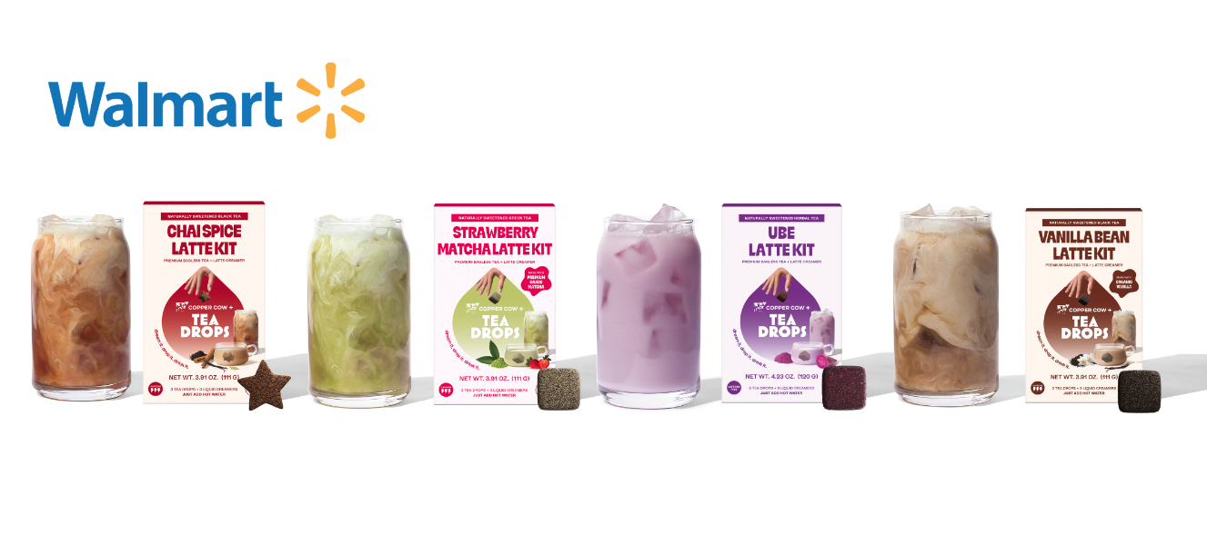 The four Tea Drops Latte Kits, available in partnership with Copper Cow creamers, are designed to bring an exceptional tea latte experience without the hassle and cost of visiting a cafe. These kits mark a pivotal moment for the cafe beverage drinker by offering a cafe quality latte at a fraction of the cost while maintaining the same premium quality. These kits will cost less than $3 per serving at an MSRP of only $7.98 per kit and can be conveniently made from home at any time. Tea Drops is also dropping a Walmart Exclusive Latte Flavor: Vanilla Bean Latte.