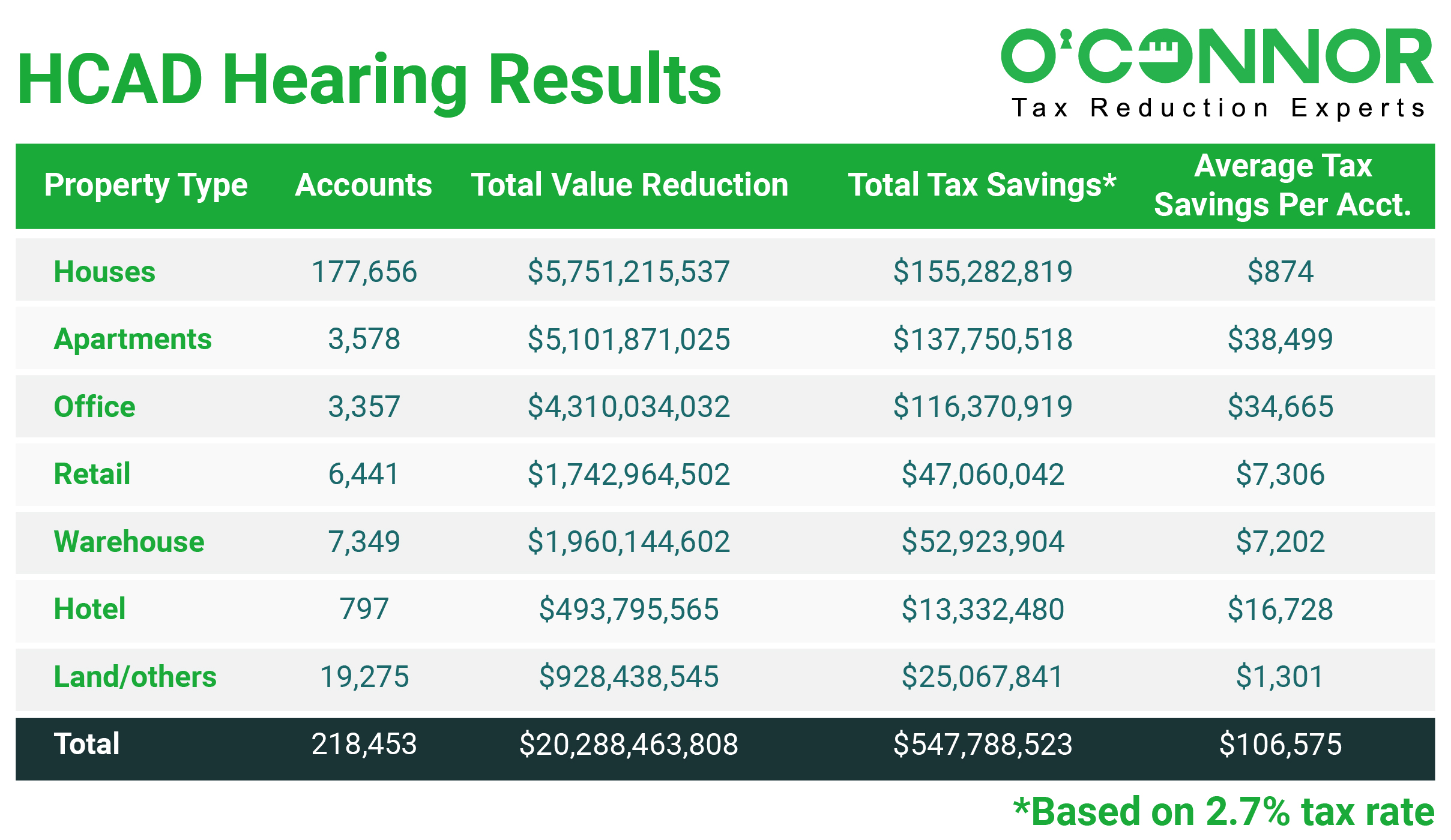 HOUSTON, TEXAS, UNITED STATES, November 6, 2023 /EINPresswire.com/ -- This is an update on the values for Harris County property owner’s 2023 property tax assessments, which now represents a $547 million reduction in taxes. While some appeals may still be unresolved, hearings for the majority of Harris County property owners have been completed. The Harris Central Appraisal District establishes the real estate and personal property’s yearly estimated market value in Harris County. The owner of the property has the ability to contest the assessment whether the value has grown or reduced from the previous year. O’Connor obtained the Harris County original, preliminary, and current tax rolls from HCAD and evaluated them to provide the following analysis.O’Connor had previously predicted that property owners in Harris County would save around $662 million in property taxes for the 2023 tax year based on a review of prior property tax decreases by Harris County Property Tax Trends.