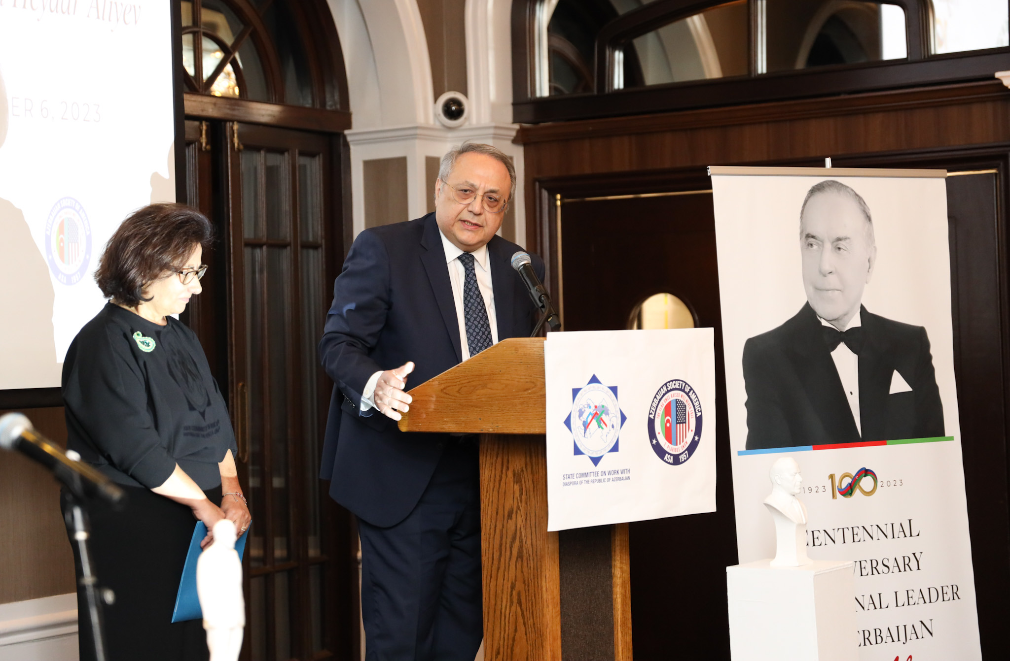 Speakers at the event were the President of Azerbaijan Society of America, Ms. Tomris Azeri, shared her own personal memories about President Heydar Aliyev, Ambassador Yashar Aliyev, highlighted, Heydar Aliyev's statesmanship and his impact on international politics, Vugar Gurbanov expressed his joy in coming together with American friends and the Azerbaijani-American community to commemorate the 100th anniversary of Heydar Aliyev and Elshad Aliyev, expressed his appreciation in celebrating the 100th birthday of Heydar Aliyev not only in NYC but all over the world.