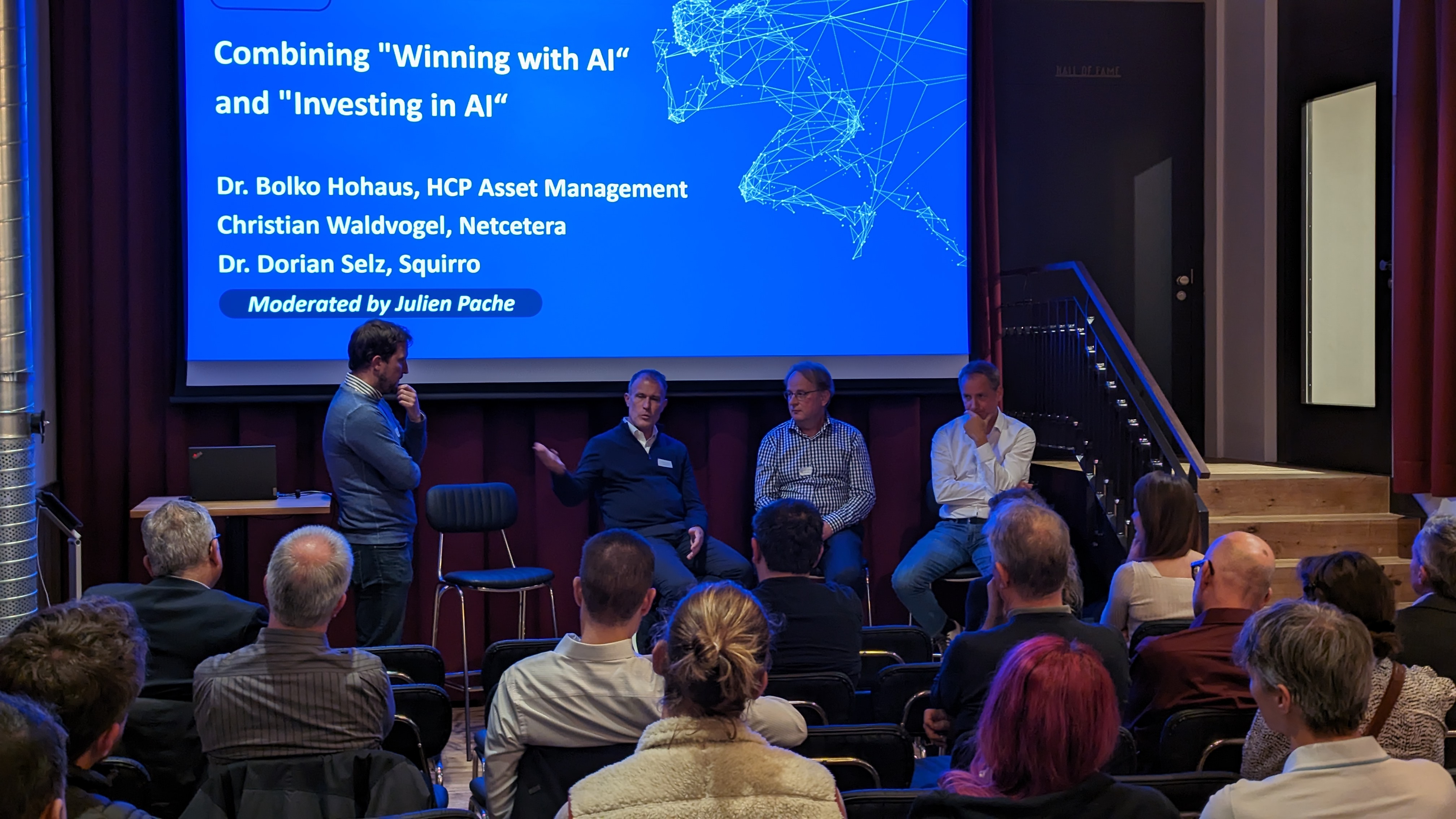 Die Podiumsdiskussion mit Dr. Dorian Selz von Squirro, Christian Waldvogel von Netcetera und Dr. Bolko Hohaus von HCP Asset Management vermittelte einen praxisnahen Einblick in die aktuellen Entwicklungen im Bereich KI mit Fokus auf den Schweizer Markt. Dorian Selz stellte unter anderem eine erfolgreiche Lösung von Squirro für eine Schweizer Versicherung vor. Wie Dorian Selz erläuterte, ermöglichte die Lösung dem Versicherungsunternehmen, mit deutlich weniger Ressourcen bessere Ergebnisse zu erzielen und eine Produktivitätssteigerung von über 900 Prozent zu erreichen. Bolko Hohaus von HCP Asset Management erklärte, dass der Einsatz von KI in der Asset Management Industrie auch mit dem sogenannten „Black-Box-Problem“ verbunden ist (damit ist gemeint, dass wir nicht sehen können, wie KI-Lösungen ihre Entscheidungen treffen). Neue KI-native Asset Management-Unternehmen wie HCP seien am besten in der Lage, dieses Problem iterativ anzugehen, fügte Bolko Hohaus hinzu. Die Softwareentwicklungsbranche nutzt KI-Lösungen bereits seit einiger Zeit im Codierungsprozess (Codier-Copiloten), so Christian Waldvogel von Netcetera. Er fügte hinzu, dass KI zwar einen größeren Teil der Low-Level-Coding-Prozesse ersetzen könne, der Bedarf an tiefem technischen Wissen wie Systemarchitektur etc. jedoch bestehen bleibe und die Nachfrage nach erstklassigen Ingenieuren weiter ankurbeln werde. Alle drei Diskussionsteilnehmer waren sich einig, dass für die erfolgreiche Entwicklung und Implementierung von KI-Lösungen in Unternehmen sowohl technische Expertise als auch Domänenwissen erforderlich sind. Da es sehr schwierig und manchmal unmöglich sei, das richtige Fachwissen und die richtigen Talente für die Entwicklung und Implementierung von KI-Lösungen intern zu erwerben, sollten alle Unternehmen in Betracht ziehen, KI-Fachwissen und -Lösungen auf dem Markt zu erwerben, wenn sie schneller sein wollen als ihre Konkurrenten.
