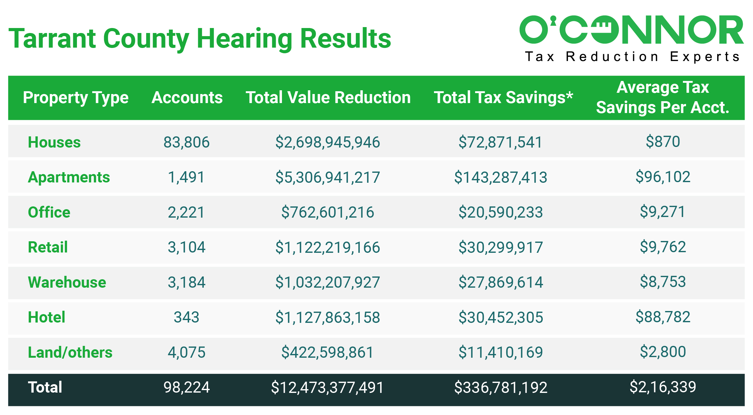 DALLAS , TEXAS , UNITED STATES , November 16, 2023 /EINPresswire.com/ -- According to the most recent data from September 2023, property owners in Tarrant County have managed to save in excess of $336 million due to the resolution of property tax disputes. This significant amount reflects the benefits received by those who chose to challenge their property tax assessments for the year 2023.Property owners in Tarrant County have the right to lawfully contest the county assessment values since the Tarrant Appraisal District yearly offers real estate and business personal property market values for the residents of Tarrant County. This right holds true regardless of whether a value has gone up or down. Based on the original and current tax records given by Tarrant Appraisal District, this data was collected by O’Connor has been parsed to illuminate how appealing assessments on an annual basis can provide material benefits to property owners.