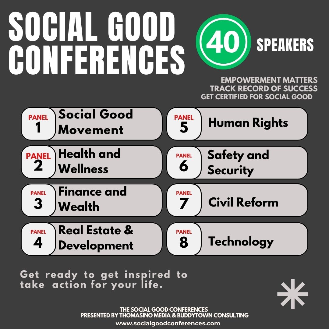 Thomasino said, "We will announce our official social good speakers panel soon. We are excited to have these powerful voices join us. The Thomasino Media Booking Executive team has been reaching out to spread the word about these various opportunities to influence others to join the Social Good Movement and amplify their message for social good. We still have a few slots left for other Social Good Influencers. Join the Social Good Movement, www.socialgoodconferences.com, and apply to be a speaker to amplify your mission for 2024. Be one of the people who contributes to our communities and creates positive outcomes. Learn from the professionals who have been engaging others in some cases for decades to help others find success. We have a lot to be grateful for and must celebrate, acknowledge, and learn from these game-changers for social good. Join the Social Good Movement today and attend the conference!"