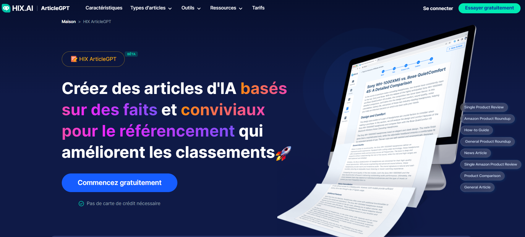 HIX ArticleGPT promet de fournir des articles de blog vraiment factuels, optimisés pour le référencement et à jour