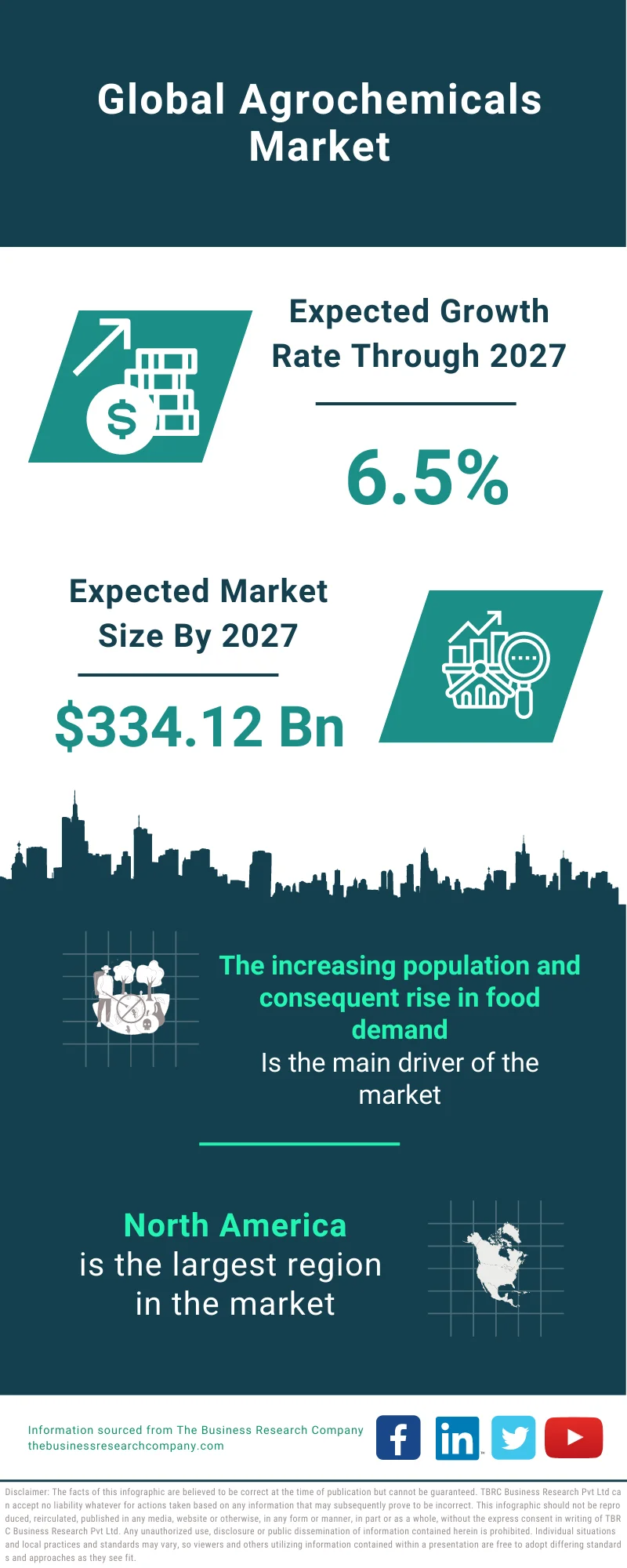 LONDON, GREATER LONDON, UK, November 15, 2023 /EINPresswire.com/ -- The global agrochemicals market is on an upward trajectory, with expectations to expand from $241.85 billion in 2022 to $259.4 billion in 2023, demonstrating a robust compound annual growth rate (CAGR) of 7.3%. Despite the disruptions caused by the Russia-Ukraine conflict and the lingering impacts of the COVID-19 pandemic on the global economy, the market is anticipated to reach an estimated size of approximately $334.12 billion by 2027, driven by a CAGR of 6.5%.
