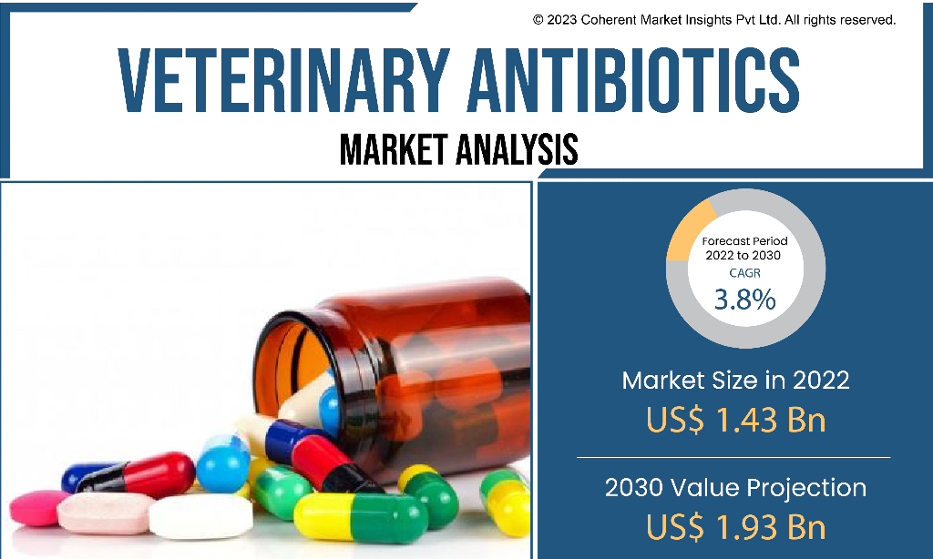 BURLINGAME, CALIFORNIA , UNITED STATES, November 15, 2023 /EINPresswire.com/ -- The Veterinary Antibiotics Market is estimated to be valued at US$ 1.43 billion in 2023 and is expected to exhibit a CAGR of 3.8% over the forecast period 2023-2030, as highlighted in a new report published by Coherent Market Insights.Market Overview: