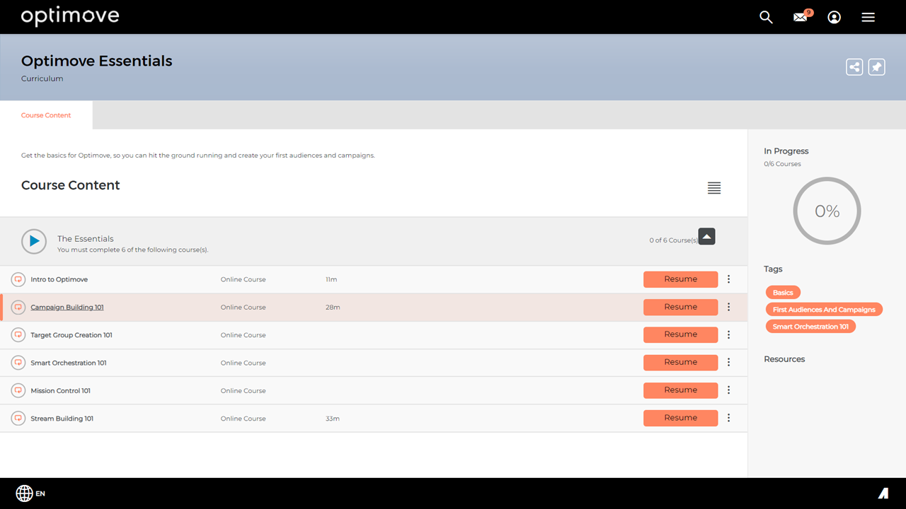 Optimove Courses’ interactive learning experience progresses logically, catering to clients’ specific needs and objectives. Each module incorporates exercises and assessments to reinforce learning and ensure a firm grasp of key concepts. The initial learning paths on the platform are: