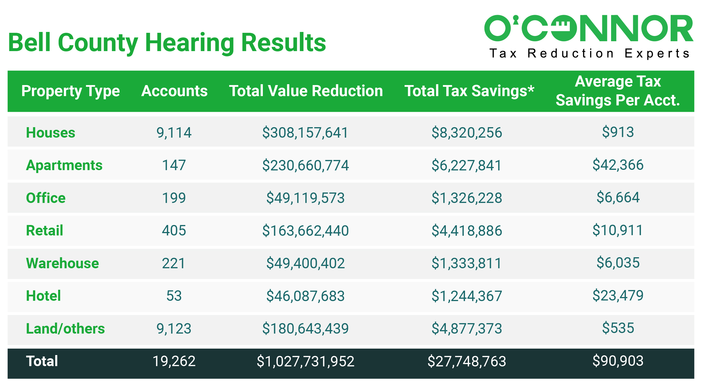 AUSTIN, TEXAS, UNITED STATES, November 22, 2023 /EINPresswire.com/ -- Property tax appeals that were resolved for 2023 allowed Bell County property owners to save over $27 million for this tax year. Who determines the real estate and personal property market values in Bell County each year? It falls under the responsibility of the Bell County Appraisal District. Regardless of whether the value is increased or decreased, property owners always have the option to challenge the estimates provided by the appraisal district each year. The Bell County Tax Appraisal District also provided the original and final tax rolls, which O’Connor used to generate the statistics below.According to O’Connor’s forecast, the property tax savings from Bell County property tax appeals in 2023 should be more than $3 million when accounting for the data for property tax savings from preceding years that is published on Bell County Property Tax Trends.