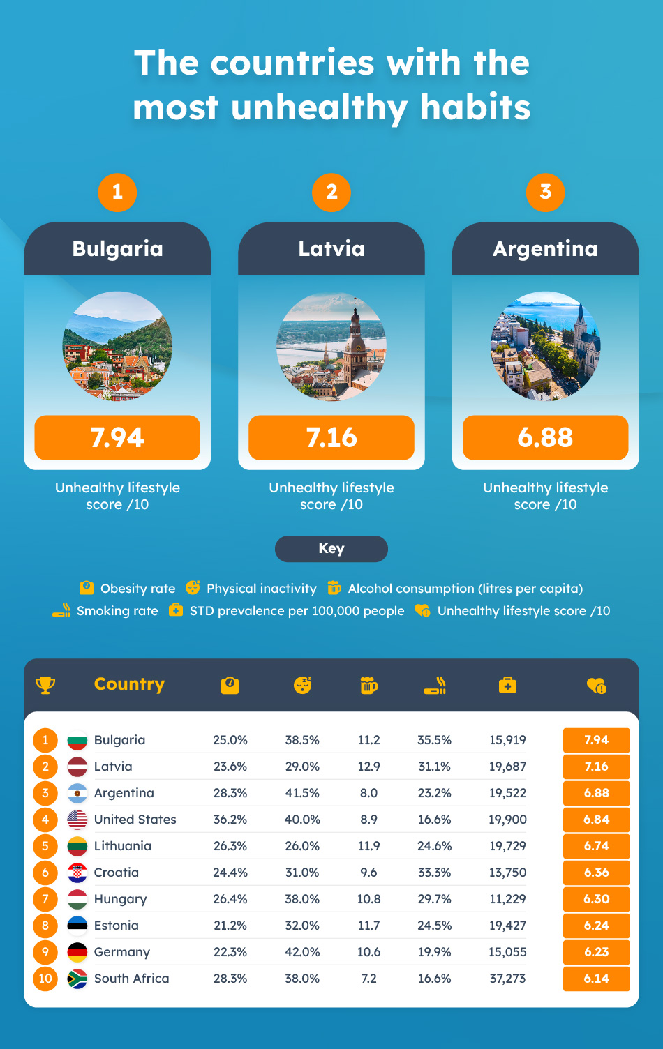 JHB, GAUTENG, SOUTH AFRICA, November 19, 2023 /EINPresswire.com/ -- The research team of Medicalaid.com conducted a study looking at 5 separate habits that are detrimental to human health across 🌎50 countries. These factors are combined into an overall “Unhealthy Lifestyle Score”, revealing the countries with the healthiest and least healthy lifestyles overall.We will then reveal the countries that fall into these bad habits the most, as well as the places that manage to best keep clear of unhealthy habits, before repeating the study with a focus on 🇺🇸 US states.