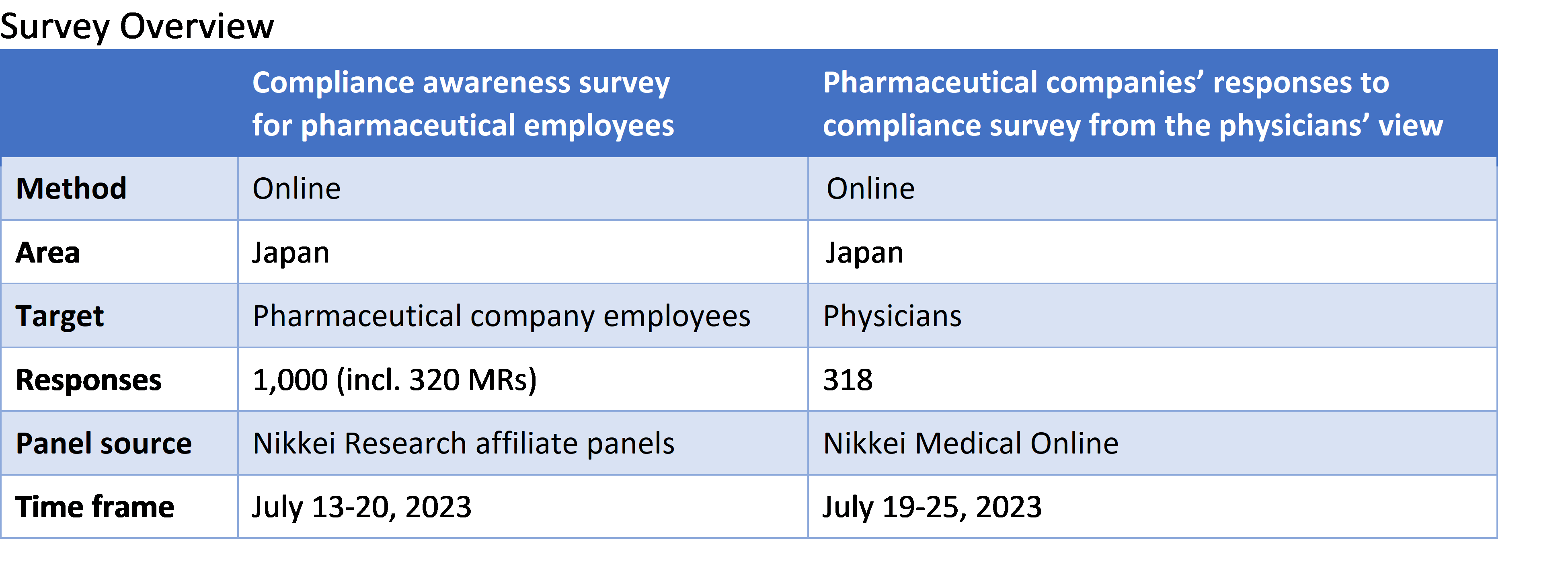 TOKYO, JAPAN, November 22, 2023 /EINPresswire.com/ -- Survey Findings on Compliance by Pharmaceutical Companies and Medical Sales RepresentativesA survey conducted in July by Nikkei Research looked into compliance awareness among employees of pharmaceutical companies and asked physicians about pharmaceutical companies' responses concerning compliance. It was revealed that 14% of MRs (medical sales representatives) have ignored the rules at least once in the past.