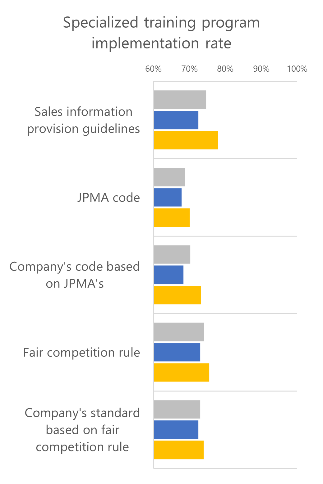 Note that due to factors such as membership, reading the results on compliance with the Japan Pharmaceutical Manufacturers Association (JPMA) code requires caution. However, there was a trend of higher implementation rates regarding the companies' own rules.