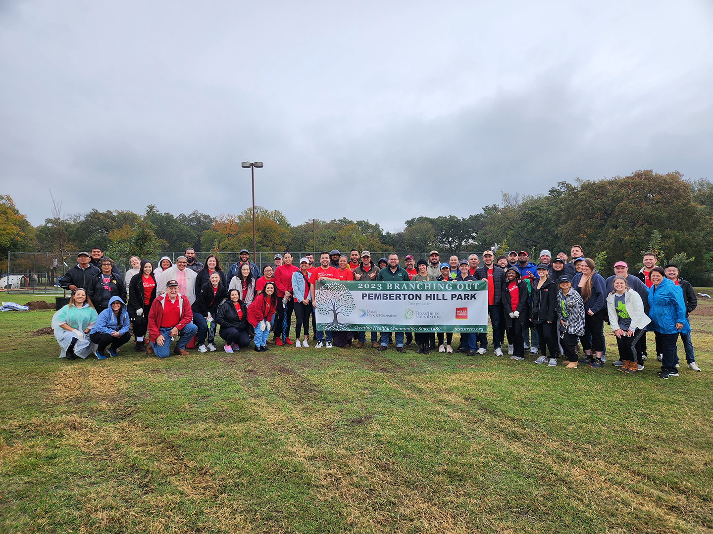 Pemberton Hill, a 38.4-acre community park, was established in 1956 and received 50 new trees last week – thanks to an outpour of support from community and corporate volunteers, as well as funding from Wells Fargo. American Elm, Bur Oak, Cedar Elm, and Pecan were among 11 species that went into the ground.