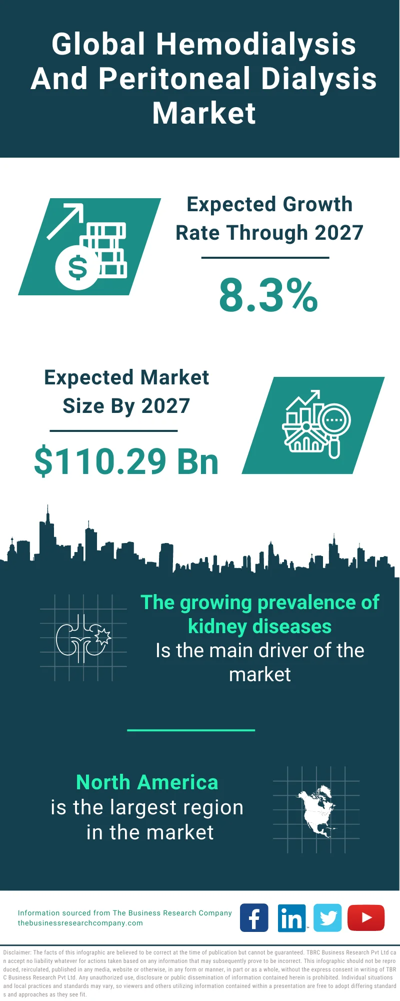 LONDON, GREATER LONDON, UK, November 22, 2023 /EINPresswire.com/ -- The global hemodialysis and peritoneal dialysis market has experienced robust growth, increasing from $73.86 billion in 2022 to $80.17 billion in 2023 at a notable compound annual growth rate (CAGR) of 8.5%. Despite the challenges posed by the Russia-Ukraine war, disrupting global economic recovery from the COVID-19 pandemic, the market is anticipated to reach $110.29 billion by 2027, with a projected CAGR of 8.3%.