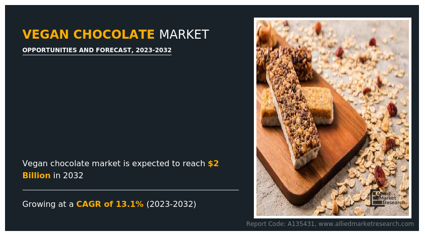 PORTLAND, OR, UNITED STATES, November 22, 2023 /EINPresswire.com/ -- According to a new report published by Allied Market Research, titled, “Vegan Chocolate Market," The vegan chocolate market size was valued at $585.80 million in 2022, and is estimated to reach $2 billion by 2032, growing at a CAGR of 13.1% from 2023 to 2032. Vegan chocolate refers to a kind of chocolate that is completely free from any animal-derived ingredients. Traditional chocolate normally contains ingredients like milk or milk solids, butterfat, and sometimes even other additives that may also come from animals. In contrast vegan chocolate is made with choice ingredients that do not contain animal exploitation or animal by-products. Common substitutes for dairy milk in vegan chocolate include plant-based milks such as almond milk, soy milk, coconut milk, oat milk, or rice milk. Instead of normal butterfat, vegan chocolate might also use plant-based fat like cocoa butter or coconut oil.