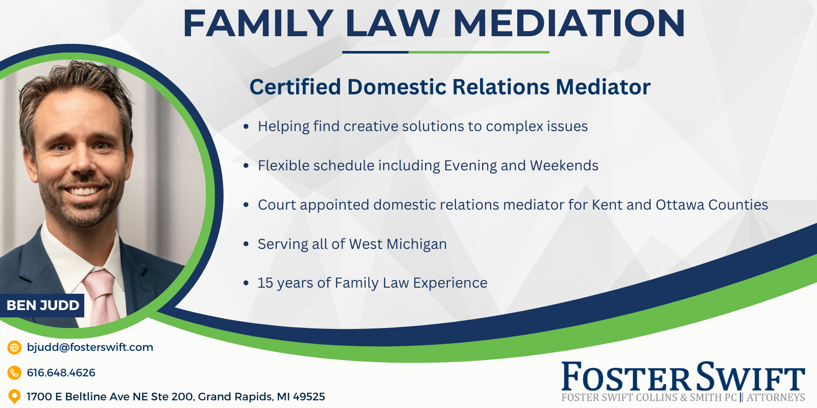 -Ben Judd (Grand Rapids): Pre-nuptial agreements, to collaborative and contested divorces, to property, child custody, and child support disputes, stepparent adoptions, and petitions for grandparenting time.