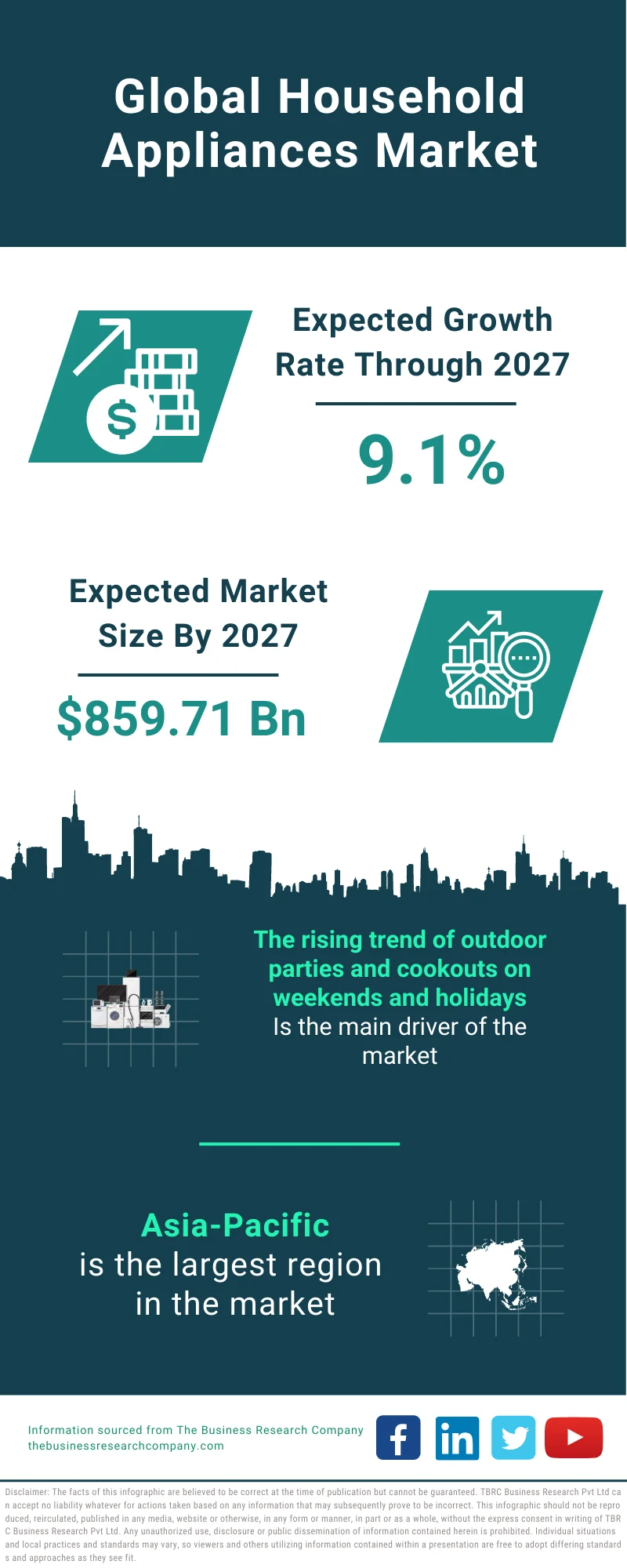The household appliances market is expanding because of the increasing popularity of outdoor gatherings during weekends and holidays. The Asia-Pacific region is anticipated to have the most significant market share in household appliances. Key players in the market are Samsung Electronics Co. Ltd., Haier Smart Home Co. Ltd., LG Electronics, Qingdao Haier Co. Ltd., and Daikin Industries Ltd.