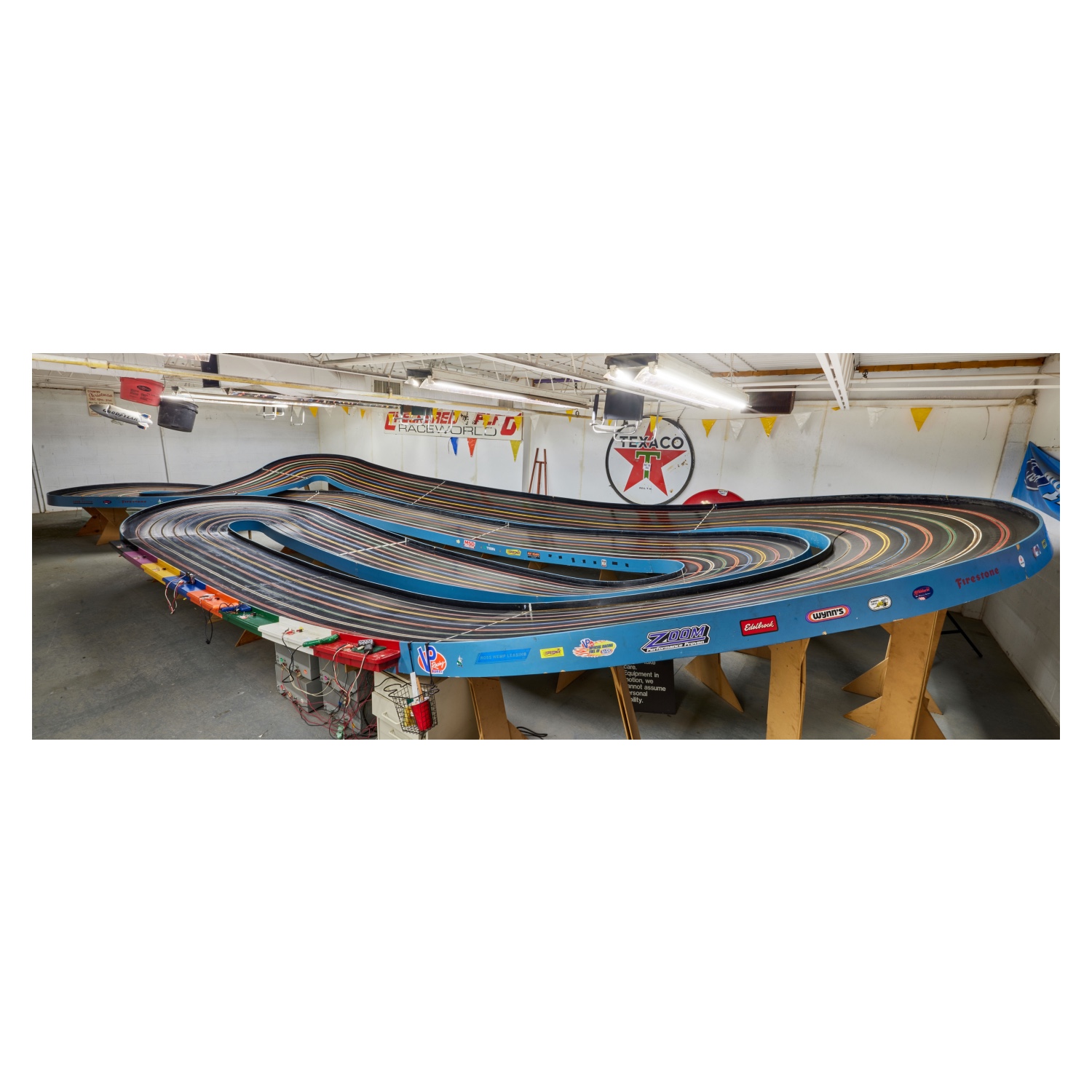 Monumental, 8-lane, 1:24 scale Arcade slot car track, laminated wood, made in Toronto, 1970s, a custom-built, 684 square foot (38 inch by 18 inch) masterpiece (est. CA$9,000-$12,000).