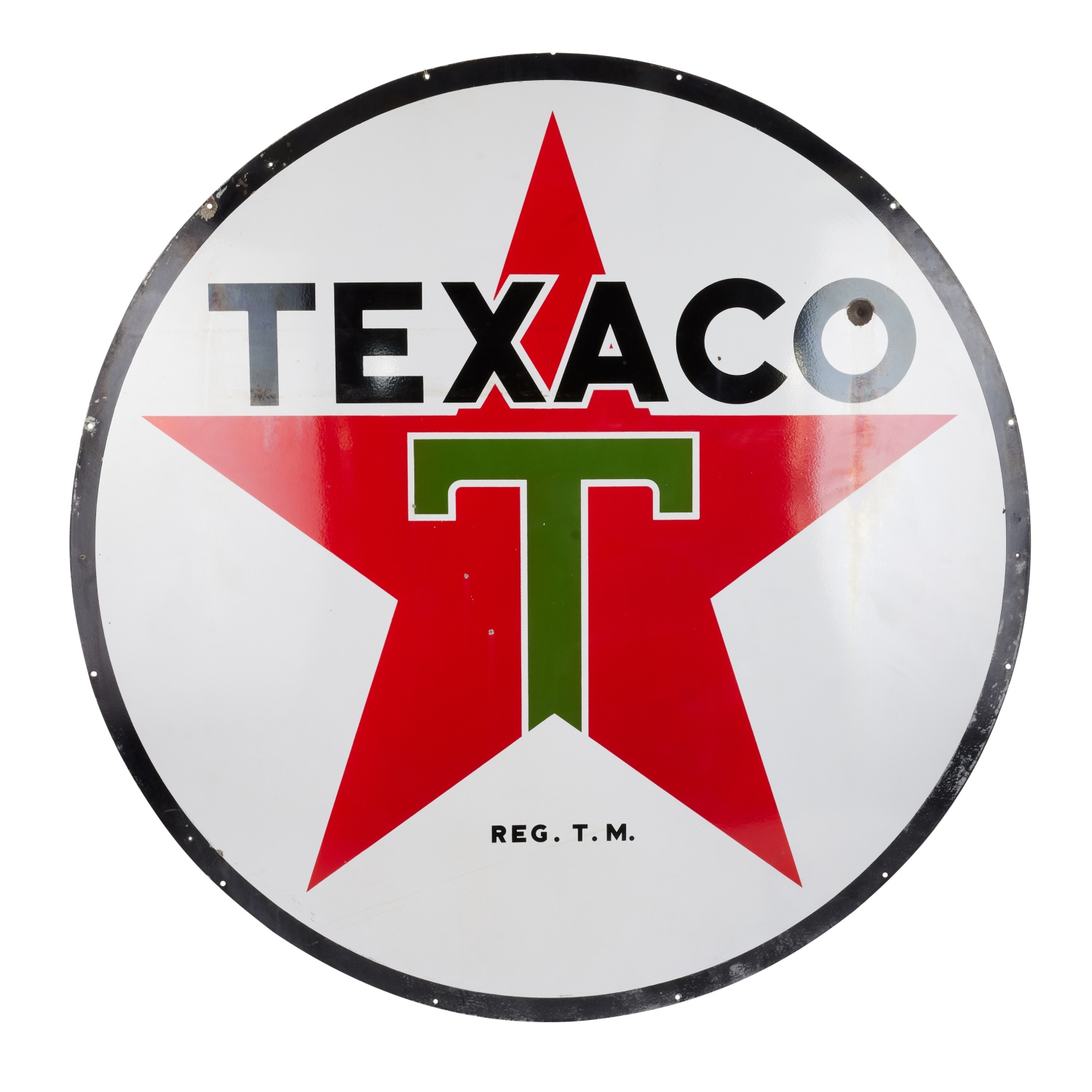 A Texaco Service Station double-sided porcelain sign (Canadian, 1950s), six feet in diameter, with excellent color and gloss, has an estimate of $3,500-$5,000. One side is in fine condition, with five minor pea-sized losses to the porcelain and minor losses around the edge and mounting holes. The other side has a four-inch loss from a bullet impact at "O", and two other areas of loss.