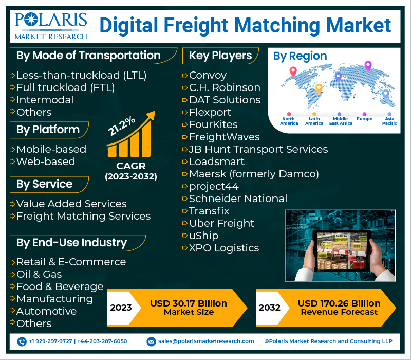New York, NY, Nov. 27, 2023 (GLOBE NEWSWIRE) -- Polaris Market Research has published a recent study report titled "Digital Freight Matching Market Share, Size, Trends, Industry Analysis Report, By Mode of Transportation (Less-than-truckload (LTL), Full truckload (FTL), Intermodal, Others); By Service; By Platform; By End-Use Industry; By Region; Segment Forecast, 2023 - 2032" in its research database.