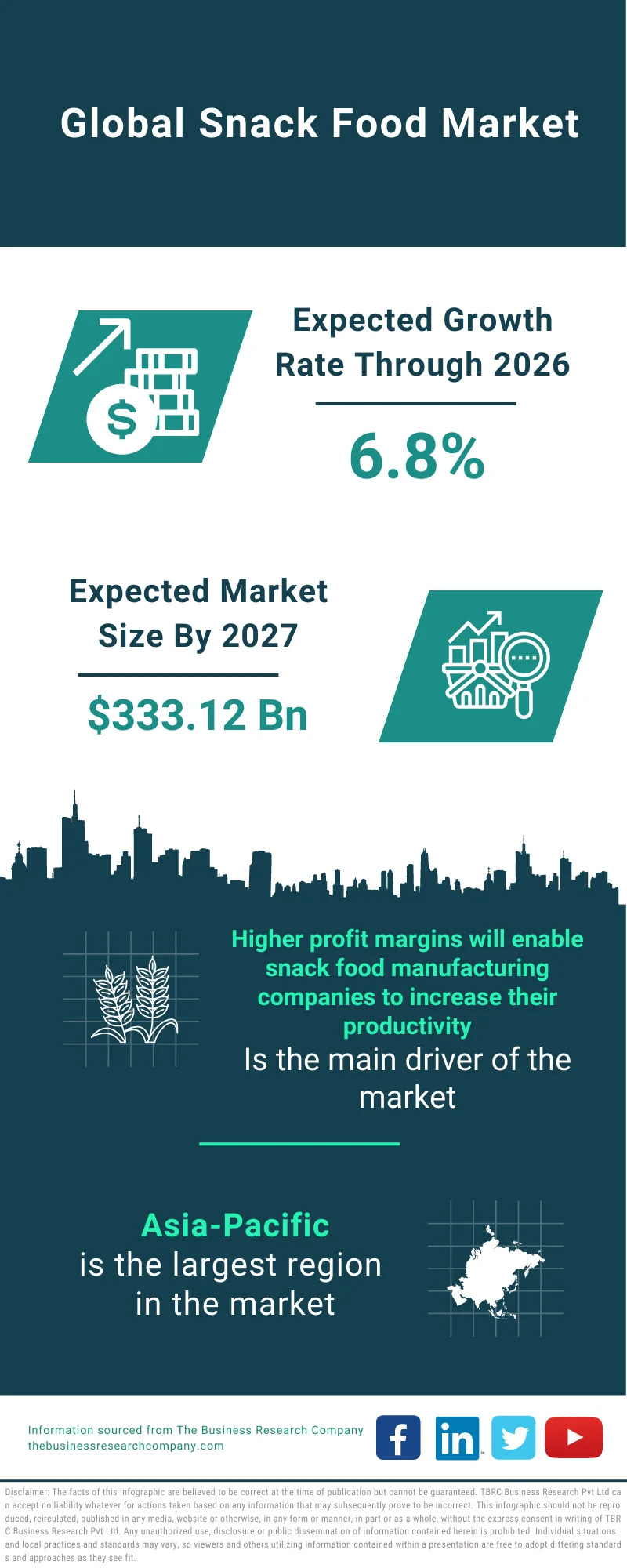 The Business Research Company’s “Snack Food Global Market Report 2023” is a comprehensive source of information that covers every facet of the market. As per TBRC’s market forecast, the snack food market size is predicted to reach $333.12 billion in 2027 at a CAGR of 6.8%.