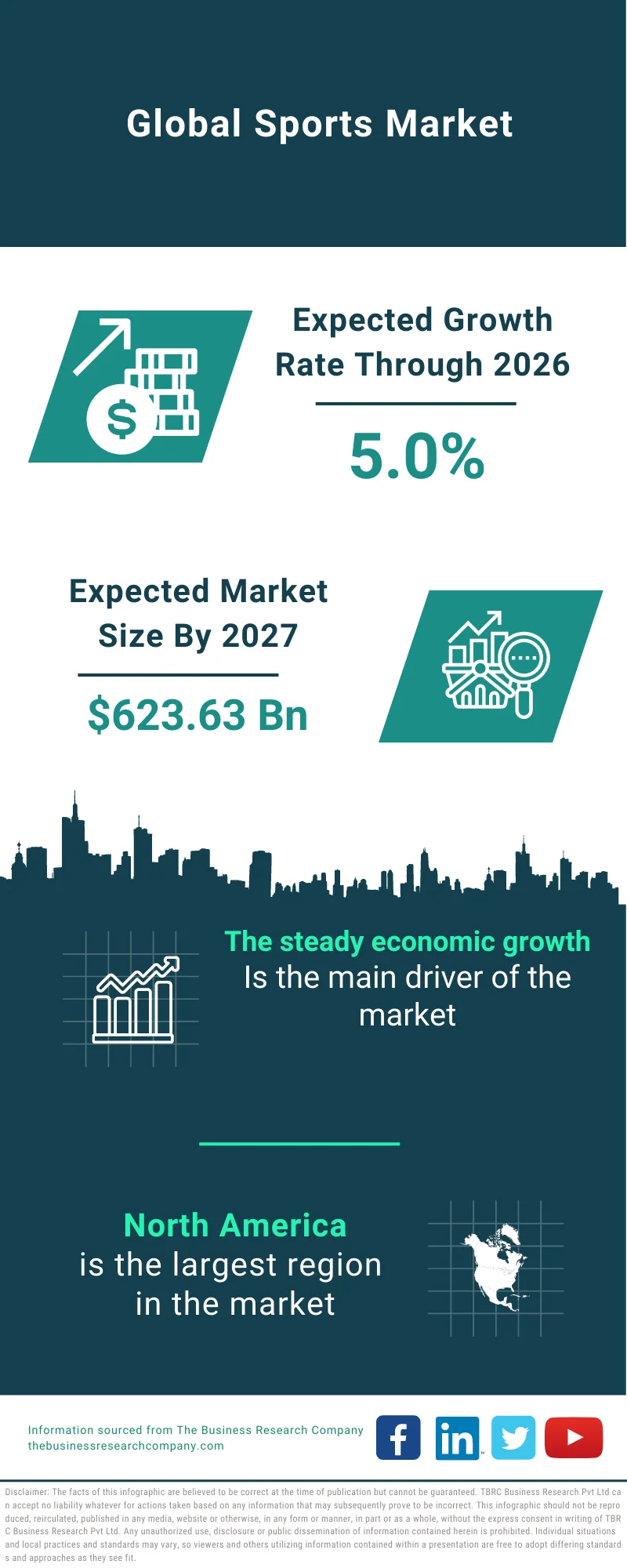 LONDON, GREATER LONDON, UK, November 28, 2023 /EINPresswire.com/ -- The global sports market exhibited robust growth, with the market size increasing from $486.61 billion in 2022 to $512.14 billion in 2023, marking a noteworthy Compound Annual Growth Rate (CAGR) of 5.2%. The market is poised for continued expansion, with an anticipated size reaching $623.63 billion by 2027, driven by a projected CAGR of 5.0%.