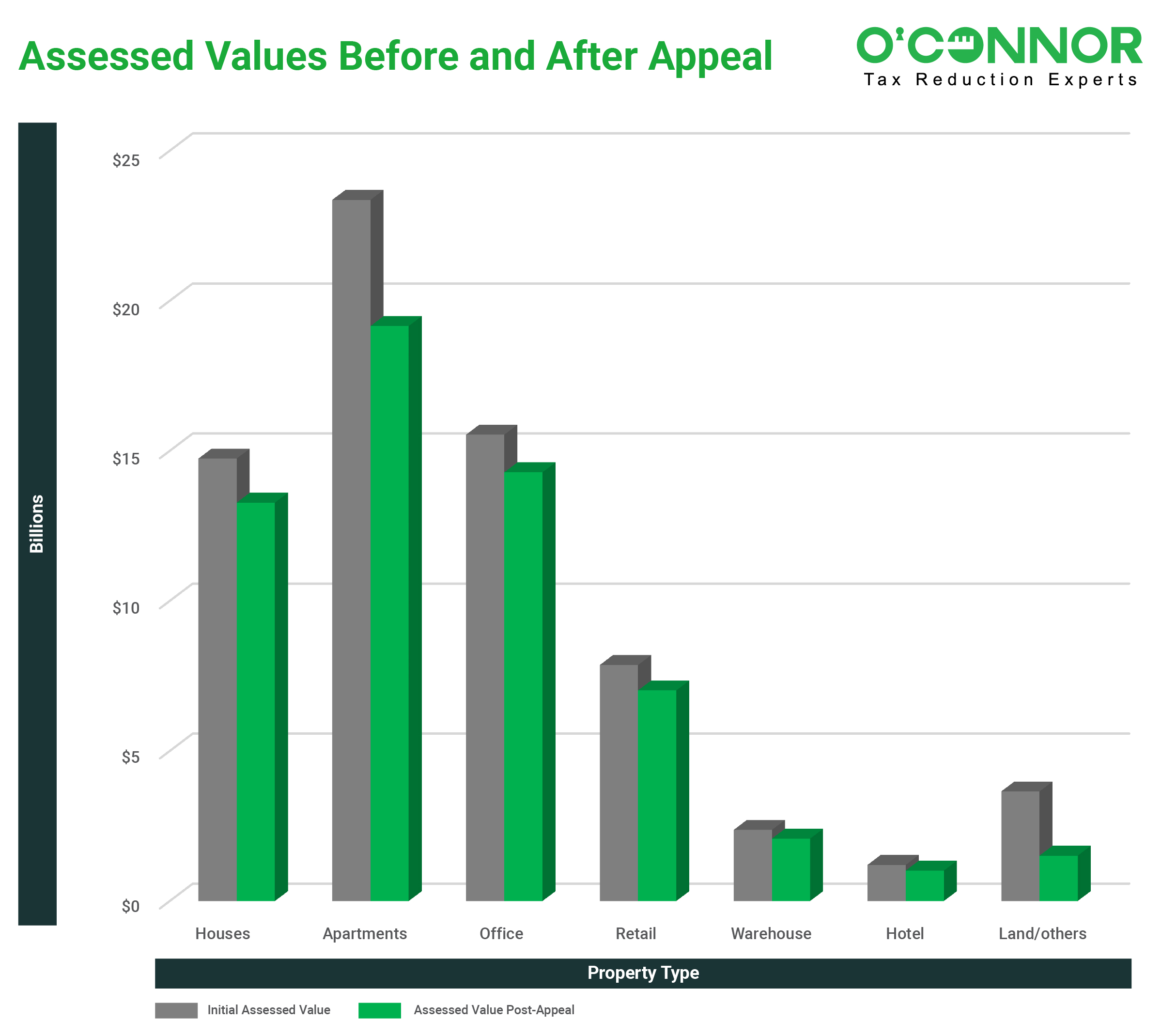 Pursuant to the conclusions of the hearings for 1,047 apartment buildings, the average tax decrease for apartments in Collin County in 2023 will be 18%, saving $108,437 in property taxes per appealed property. The original value of apartment accounts that will now be used to calculate tax in 2023 was reduced from $23 billion to $19 billion, saving $4 billion in tax assessments. At a tax rate of 2.7%, the total property tax savings for apartment buildings up to this point total $113 million.
