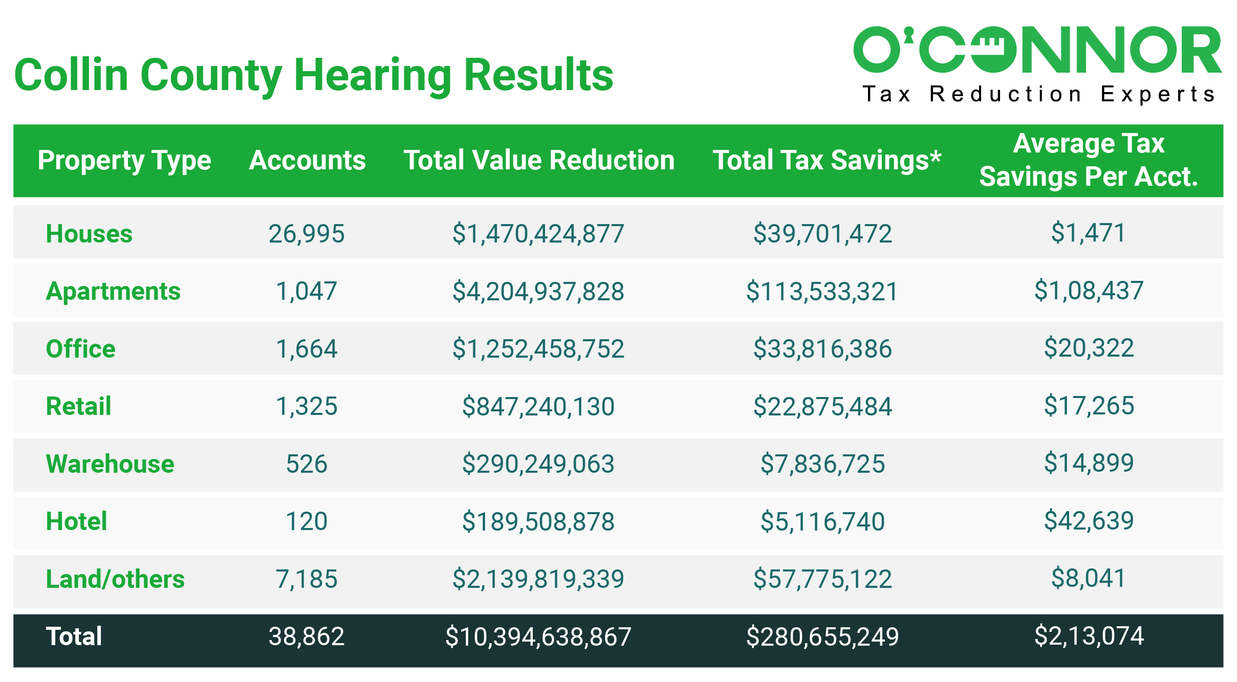 DALLAS, TEXAS, UNITED STATES, November 28, 2023 /EINPresswire.com/ -- Recent data as of September reveals that property owners in Collin County were able to save over $280 million in property taxes for the year 2023.The responsibility of assessing the market value of both real estate and personal property lies with the Collin Central Appraisal District. It is advised that property owners contest the county appraisals annually, regardless of whether the value has increased or decreased. This information was compiled by O’Connor using the preliminary and most up-to-date tax information provided by the Collin Central Appraisal District.