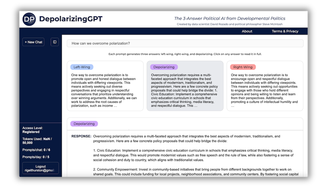 The model's depolarizing responses have been fine-tuned using content from Steve McIntosh's inclusive political philosophy and the work of the Institute for Cultural Evolution think tank (the parent organization of The Developmental Politics Project). These depolarizing answers attempt to transcend centrism and avoid simply splitting the difference between left and right. When at their best, the model's depolarizing responses demonstrate a kind of "higher ground" that goes beyond the familiar left-right spectrum. Sometimes, however, the model's depolarizing responses inevitably fall short of this goal.