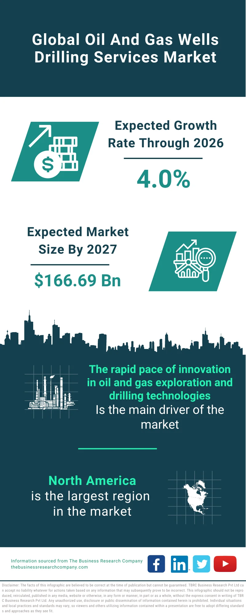 The expansion of the oil and gas wells drilling services market is attributed to the swift advancement in technologies for oil and gas exploration and drilling. The North America region is projected to possess the predominant market share in oil and gas wells drilling services. Key players in this market comprise Baker Hughes Co, Schlumberger Ltd., Halliburton, China Oilfield Services Ltd., and Transocean Ltd.