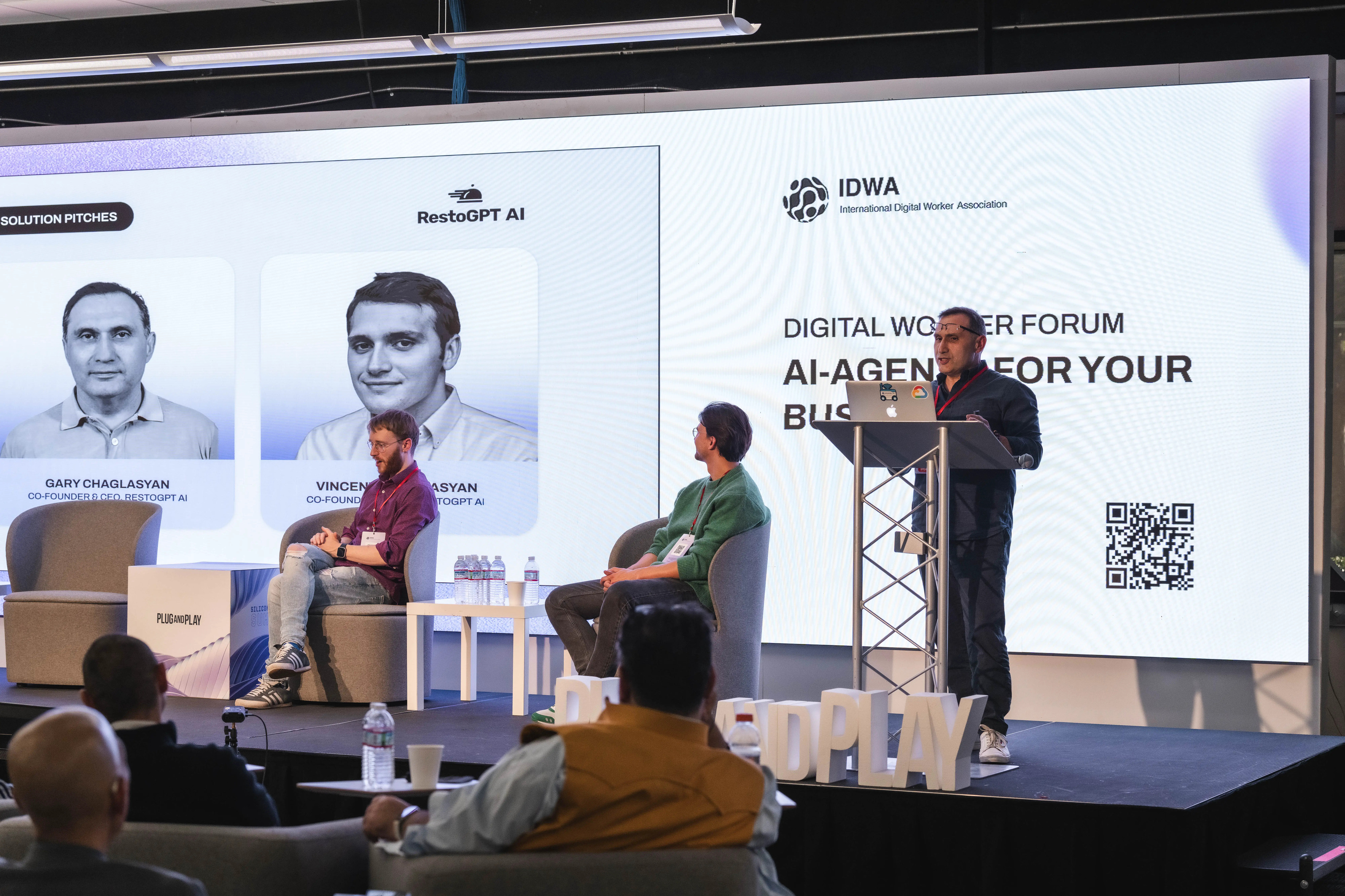 Among the speakers and featured AI startups, RestoGPT AI took the spotlight, being the first restaurant tech startup to bring AI agents to restaurant delivery and join the IDWA, with co-founders Gary and Vincent Chaglasyan present at the conference.
