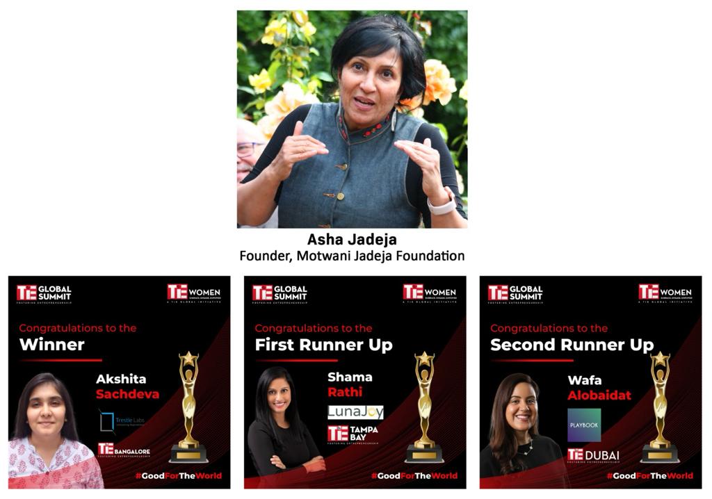 Asha Jadeja, founder of the Jadeja Motwani Foundation and platinum sponsor of the TiE Women program shared her thoughts about the competition ‘I am delighted that top women entrepreneurs from the global south now have this powerful international platform created by Motwani Jadeja Foundation and TiEGlobal. We will be taking these stellar entrepreneurs all the way to Silicon Valley, our own home. Becoming an integral part of the Valley and our MJ Women Entrepreneurs program will provide unparalleled access to the heart of innovation, entrepreneurship and disruptive tech breakthroughs of our planet. We want these new connections to energize and catalyze future generations of women entrepreneurs back in the home countries of our recipients. Exciting times ahead.’