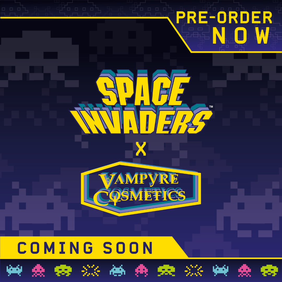 Pre-orders for the Space Invaders collection are set to begin December 4 2023, inviting makeup enthusiasts and retro gaming fans alike to indulge in the nostalgia and excitement of this cosmic collaboration. Stay tuned for a makeup collection that promises to be more than just cosmetics; it's a journey back in time to the arcade era, reimagined with Vampyre Cosmetics' signature style and ethical excellence.
