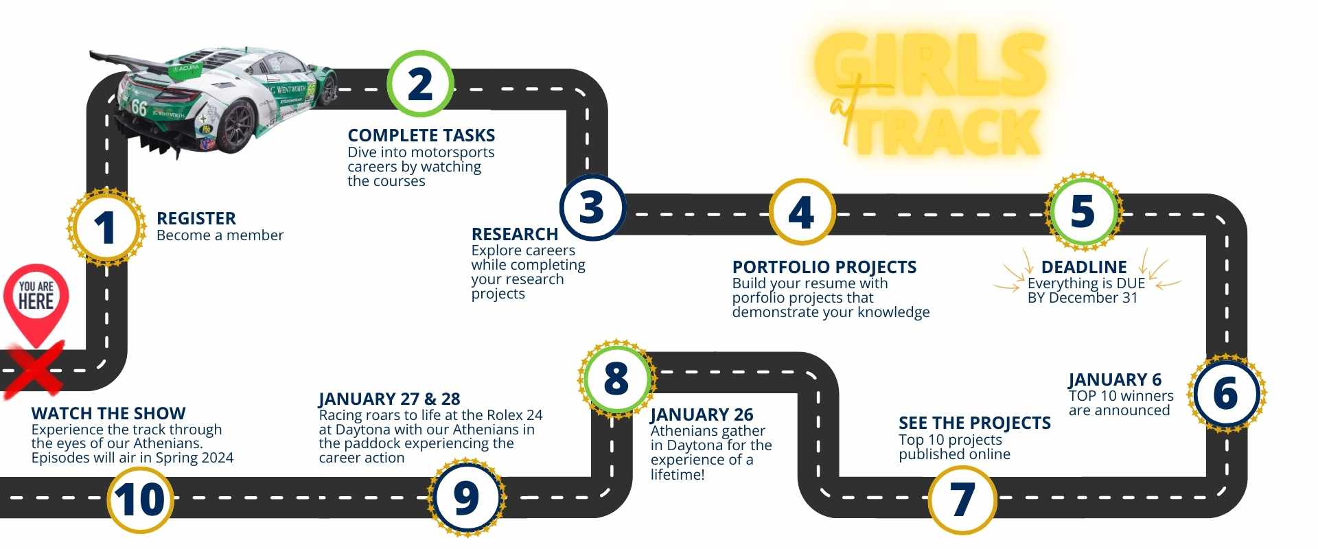 The “Girls at Track” Competition, open to all middle school and high school girls nationwide, encourages those interested in competing to become members of BeAthenian.org. By joining, girls gain access to exclusive resources and opportunities to immerse themselves in the thrilling world of motorsports. The deadline for scoring points in the competition is December 31, so aspiring racers and motorsports enthusiasts are encouraged to register and start accumulating points now.