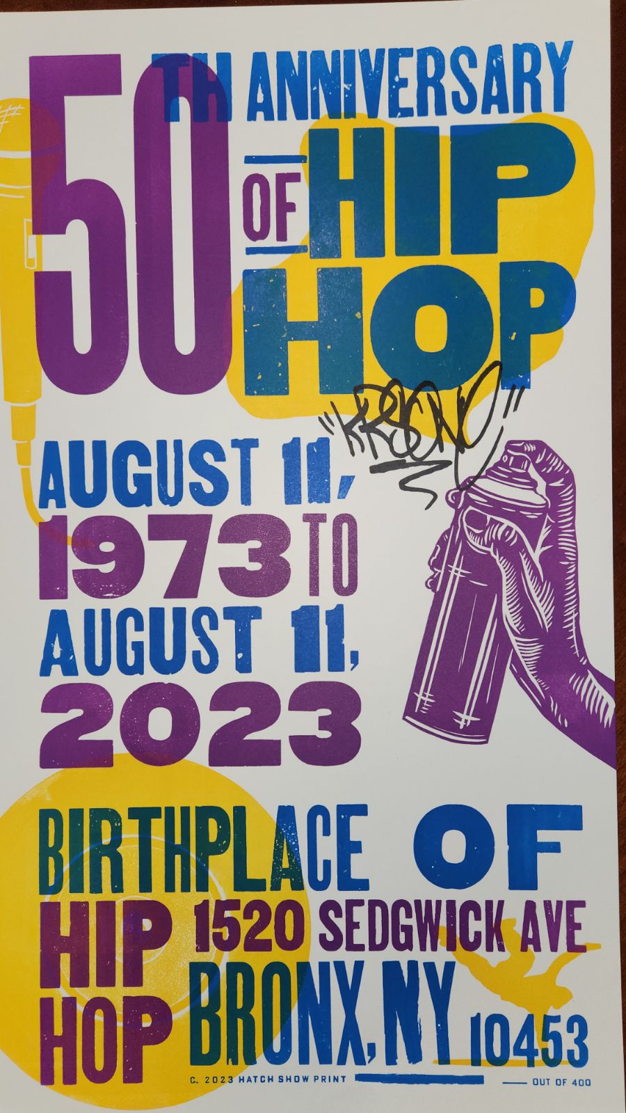 Relive Hip Hop's 50th Birthday with the official "50 Years Of Hip Hop" poster signed by Hip Hop legend KRS-ONE and printed by Hatch Show Print Shop. Purchase a limited edition poster ($250) at birthplaceofhiphop.nyc/shop/ or on eBay. Those who attended the anniversary celebration are invited to send their videos and photos to info@birthplaceofhiphop.nyc to be included in a media compilation of the event. Let's come together to celebrate 50 years of Hip Hop and support the room that has played a crucial role in its evolution.