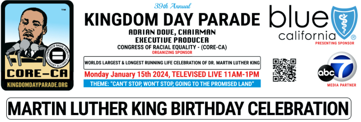 LOS ANGELES, CA, UNITED STATES, December 7, 2023 /EINPresswire.com/ -- On Monday, January 15th, 2024, one of the most notable celebrations of Dr. Martin Luther King's Birthday and his unique life contributions to America and the world will be celebrated again in the heart of South Central Los Angeles on his birthday. This year will constitute the 39th Annual Kingdom Day Parade (aka MLK or King Day Parade). The Theme for January 15, 2024, has been aptly titled “Can’t Stop, Won’t Stop, Going To The Promised Land”. The parade will be televised live on ABC from 11:00 am-1 pm.For the past thirty-eight years, the Kingdom Day Parade has been broadcast live on television and has grown from its original small neighborhood event into its current iconic mass celebration with over 200,000 on-site attendees and a viewing audience of over 2.4 million for the past thirteen years on Disney/ABC 7. The mission of the Kingdom Day Parade in LA, as expressed by the Parade’s first Grand Marshall, Stevie Wonder, is different from all other parades in that it was born out of a curative response to America’s ongoing struggle since its beginning, to make a simple majority democracy rule to rise to its calling to achieve true equality for all Americans regardless of their status by gender, age, social or economic status, ancestry, and or so-called race. In the words of Abraham Lincoln, America can become the world's last best hope for Democracy.