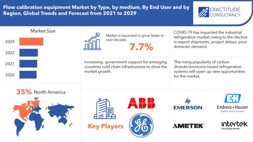 According to a Comprehensive Research Report by Exactitude Consultancy, “Flow Calibration Equipment Market by type (Calibration and recalibration), medium (Liquid and Gas), meter type (Volume flow and mass flow), calibration site (In-house, User site and Laboratories), by end use (Agriculture, Aerospace and defense, Power and energy, water management, industrial manufacturing, pharmaceuticals, Petrochemicals and others) and Region, Global trends and forecast from 2021 to 2029”, The Flow Calibration Equipment Market is estimated to grow at a CAGR of 7.7% in the forecasted period, from a market value of USD 3.9 billion in 2021 to USD 7.06 Billion in 2029.