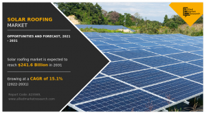 WILMINGTON, DELAWARE , UNITED STATES, December 7, 2023 /EINPresswire.com/ -- The solar roofing market size was valued at $59.4 billion in 2021, and is estimated to reach $241.6 billion by 2031, growing at a CAGR of 15.1% from 2022 to 2031. Solar roofing is a type of roofing that collects and stores solar energy using solar panels. This energy may then be utilized to power households and workplaces. Owing to its significant advantages, the solar roofing business is steadily expanding. Solar roofs provide a clean and sustainable source of energy while saving consumer power costs. Solar panels give an extra layer of insulation, allowing buildings to be cooler in the summer and warmer in the winter. Solar roofs have no negative environmental consequences, making them ecologically responsible options for both commercial and residential buildings.