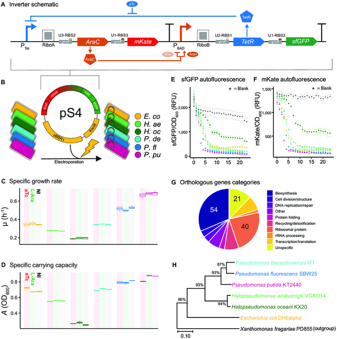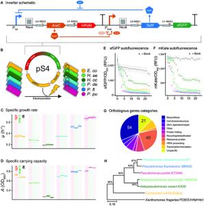 Next, they used electroporation to introduce pS4 (containing inverter) into six Gamma proteobacteria species, namely, E. coli, H. aestusnigri, H. oceani, Pseudomonas deceptionensis M1, P. fluorescens, and P. putida. From the growth pattern analysis of the genetically engineered bacteria and their wild type (non-engineered) counterparts, they found that closely related hosts shared similar physiologies.