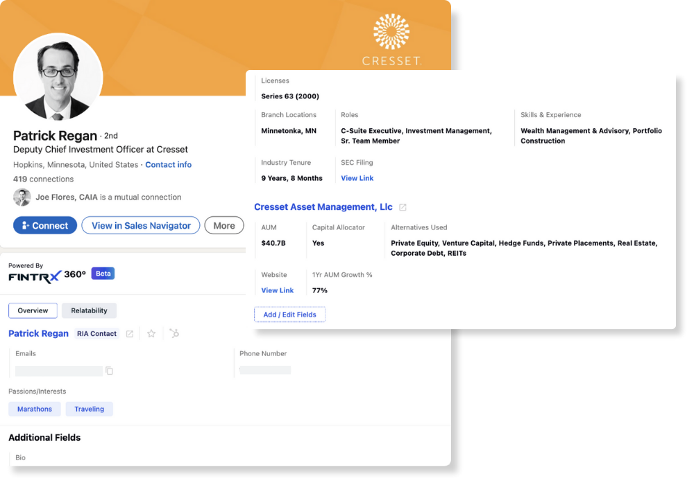 The FINTRX 360 LinkedIn Integration brings the wealth of data from the FINTRX family office and RIA (Registered Investment Advisor) data platform directly into the LinkedIn interface. When viewing a LinkedIn profile, FINTRX users can now access a rich dataset that provides an in-depth look at 50+ FINTRX data points to view on each contact directly within LinkedIn. Pull in email addresses, passions, interests, smart bios', contact roles & responsibilities, disclosures, firm AUM, growth rates, and more. This first-of-its kind integration serves as a bridge to more personalized and informed interactions, empowering professionals in wealth management, asset management, and financial advisory services to engage with a tailored approach.
