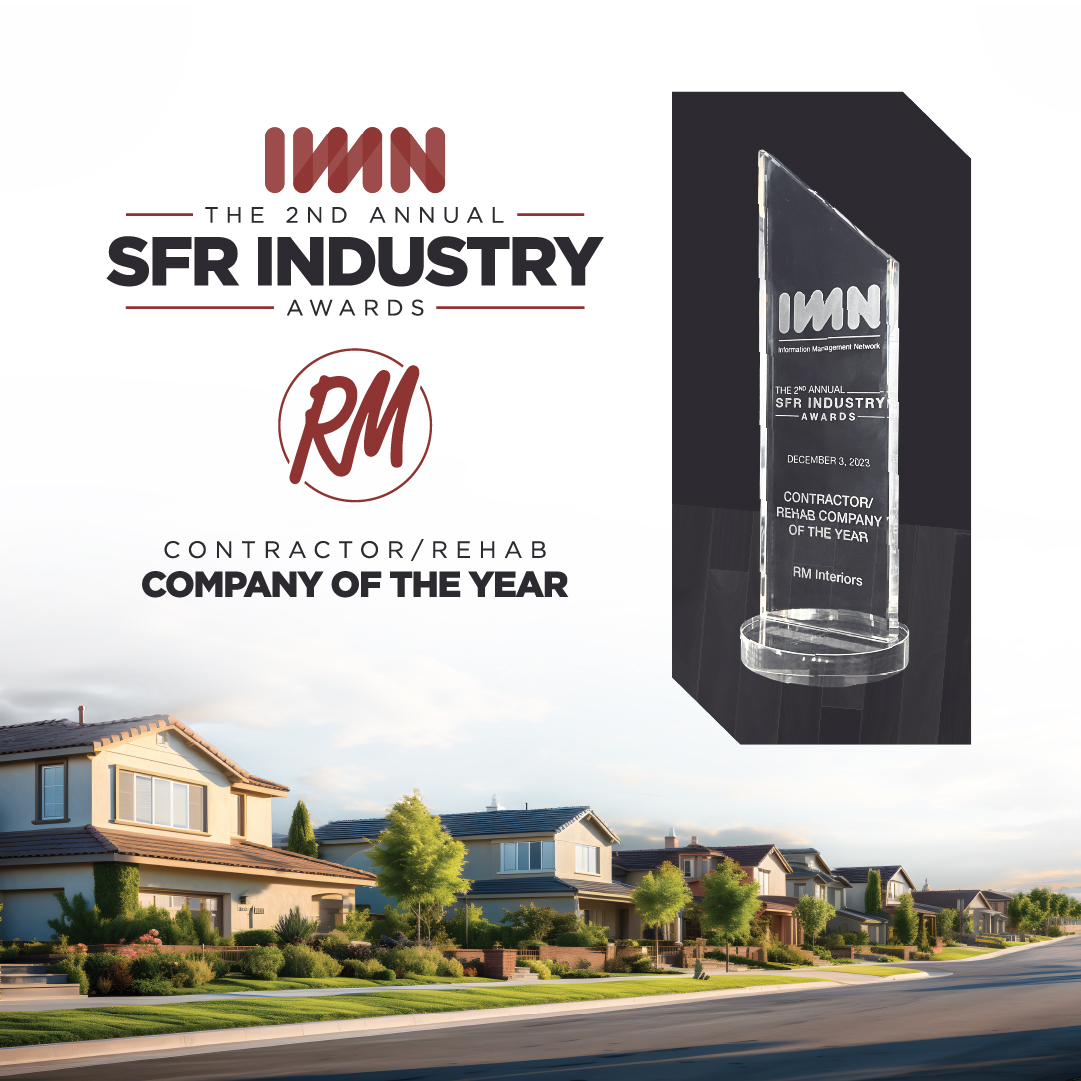 SCOTTSDALE, ARIZONA, UNITED STATES, December 13, 2023 /EINPresswire.com/ -- RM Interiors (RMI), was awarded The Contractor/Rehab Company of the Year Award at the second annual IMN SFR Industry Awards in Scottsdale, AZ last week. The award recognizes excellence across a variety of categories including completing projects on time, implementing innovative processes, sourcing materials, cost-effectiveness, and customer satisfaction. RMI is the longest standing flooring provider in the SFR space, having serviced the industry since it exploded in 2011.