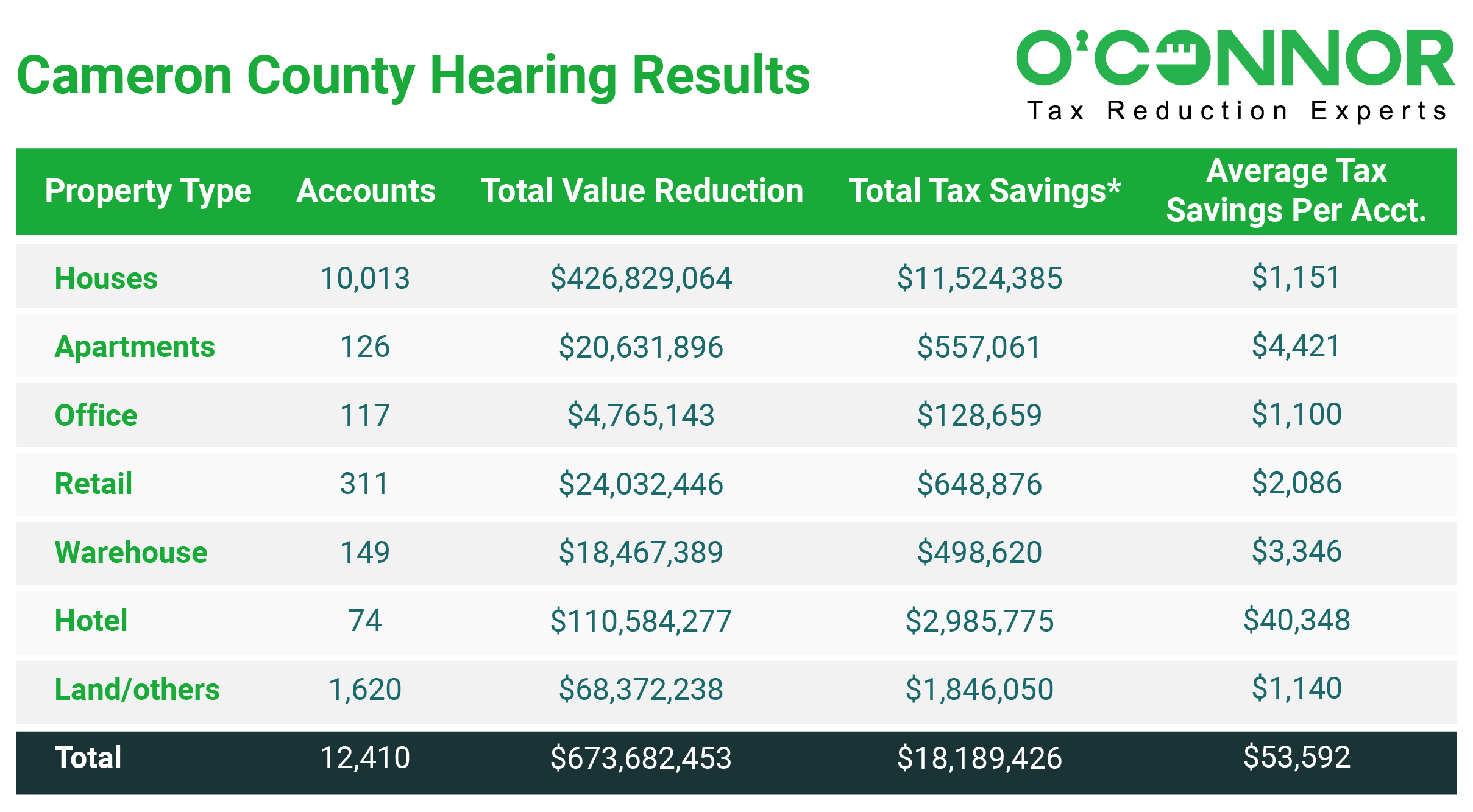 SAN ANTONIO, TEXAS, UNITED STATES, December 13, 2023 /EINPresswire.com/ -- The finalized property tax protests for 2023 have resulted in a little over $18 million in savings for Cameron County property owners. As a property owner, you have the right to contest those assessments every year, whether the value has grown or decreased. The Cameron Appraisal District is in charge of determining the market value of all real estate and personal property located within Cameron County. In order to create this blog, O’Connor consulted data from the Cameron Appraisal District’s original and most recent tax rolls.As noted in a recently published blog post, O’Connor predicted that the total amount of property taxes that Cameron County property tax appeals would save the county in 2023 would be roughly $9.42 million. The data is determined by an analysis of the information from recent years’ property tax savings as published on Cameron County Property Tax Trends. Property owners in the county are sure to be delighted that actual 2023 property tax savings in Cameron County were nearly double the estimate.