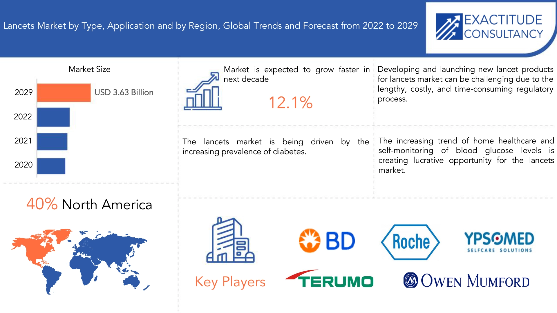 The lancets market is expected to grow at 12.1 % CAGR from 2022 to 2029. It is expected to reach above USD 3.63 billion by 2029 from USD 1.3 billion in 2020.