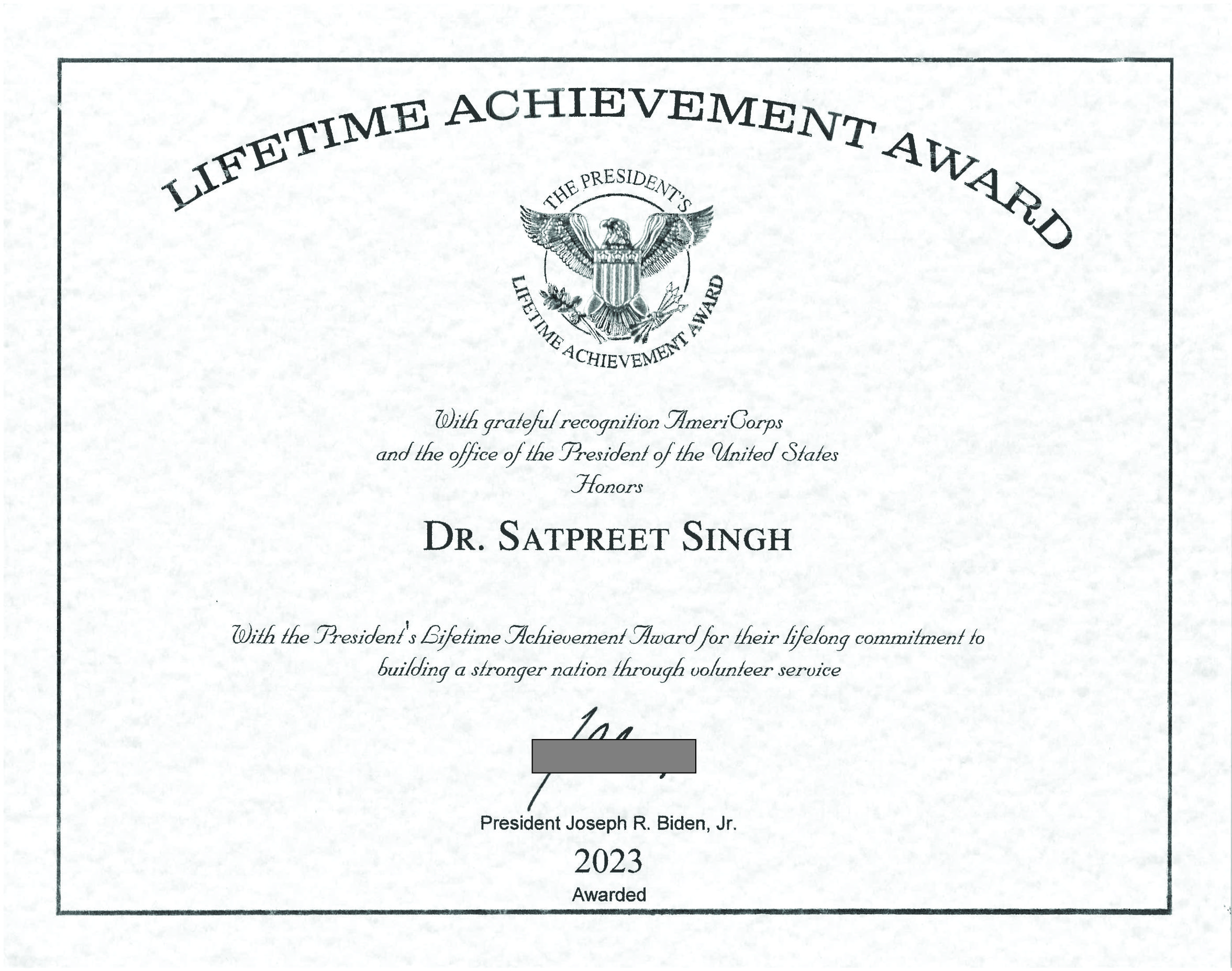 The Presidential Lifetime Achievement Award for Volunteer Service is a prestigious national honor that recognizes individuals like Dr. Satpreet Singh, who have gone above and beyond in their commitment to community service. President Joseph R. Biden and his office have chosen to acknowledge Dr. Satpreet Singh's exceptional contributions, highlighting the significant positive impact he has made on the community, contributing to the overall strength and resilience of the nation.
