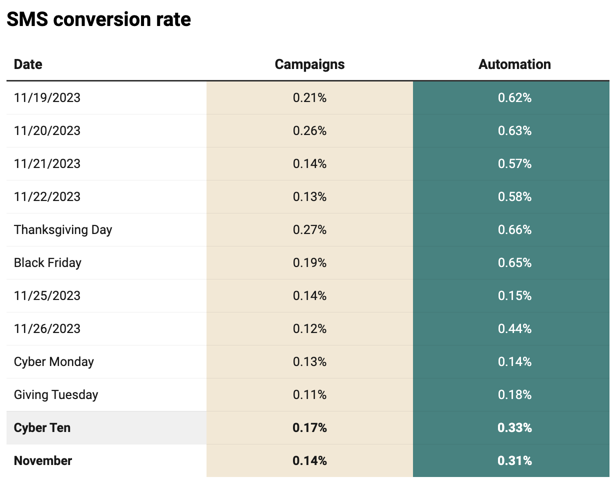 ** Automated SMS during the Cyber Ten increased by 199%. Compared to scheduled SMS campaigns, automated SMS converted 91.7% better.