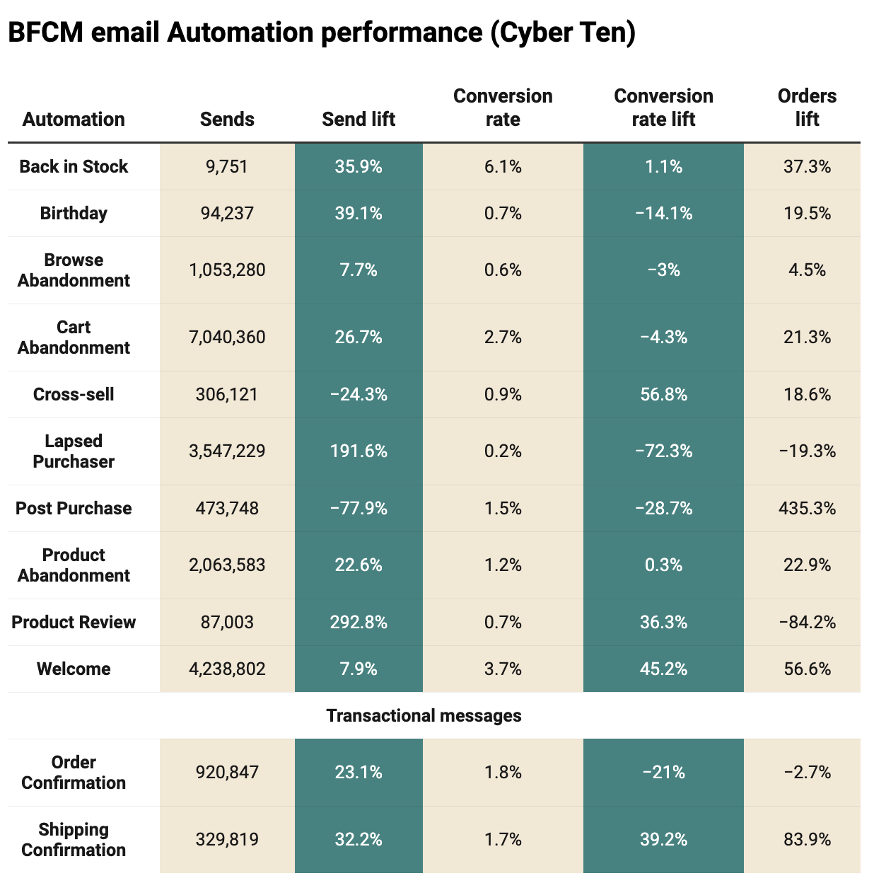 ** Automated push messages made up 18.8% of push message orders and 2.3% of sends during the Cyber Ten.