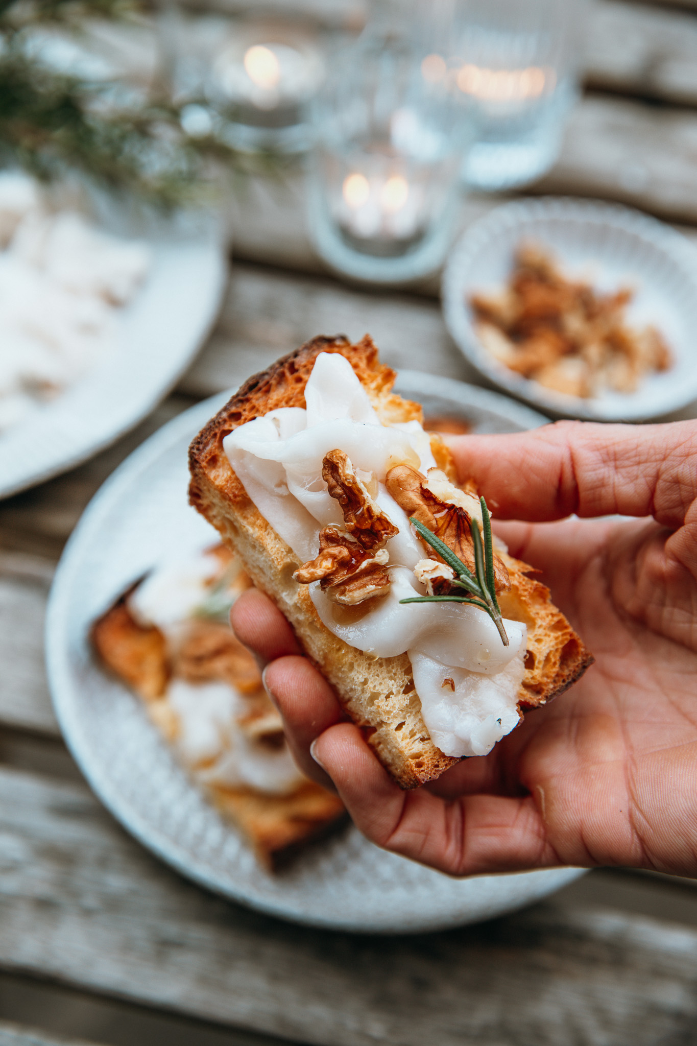 📍 Haal het brood uit de oven en begin met het maken van de crostini: eerst de Lardo di Colonnata IGP, gegarneerd met een walnoot, een beetje rozemarijn en een vleugje honing.
