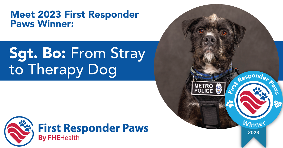 “The First Responder Paws Therapy Dog Award is an extension of our commitment to first responder mental health, through our nationally recognized, specialized treatment program Shatterproof FHE Health,” FHE Health Chief Operating Officer Rami Sleiman said. “We are grateful to be able to draw national attention to the good work of Sgt. Bo and Officer Okert and to recognize the heroic contributions of the more than 50 other dogs that applied for this award. Each of them has an inspirational story of how they are bringing hope and healing to their community.”
