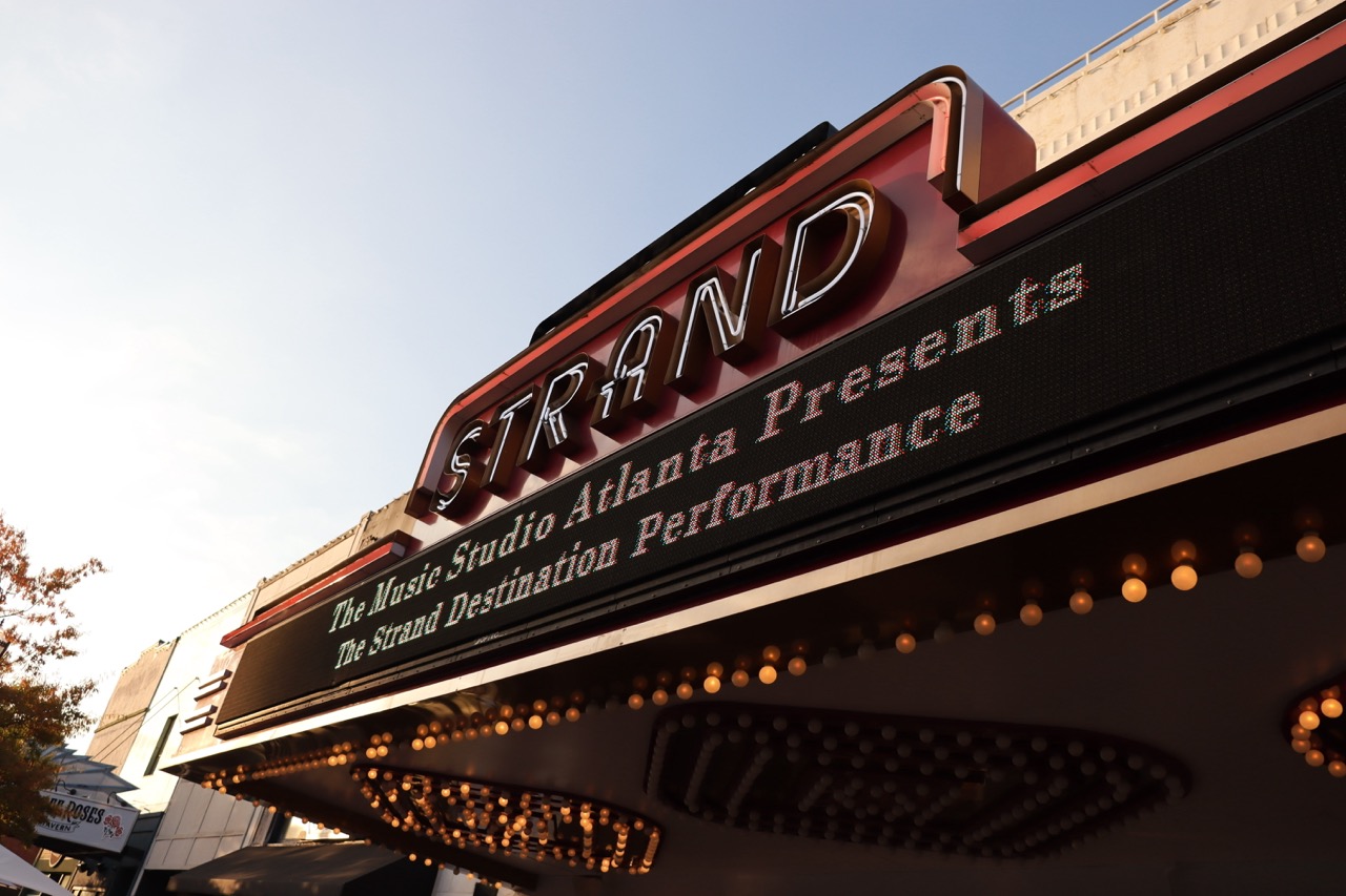 Marquee sign of the Strand Theatre with illuminated lights, displaying 'The Music Studio Atlanta Presents The Strand Destination Performance
