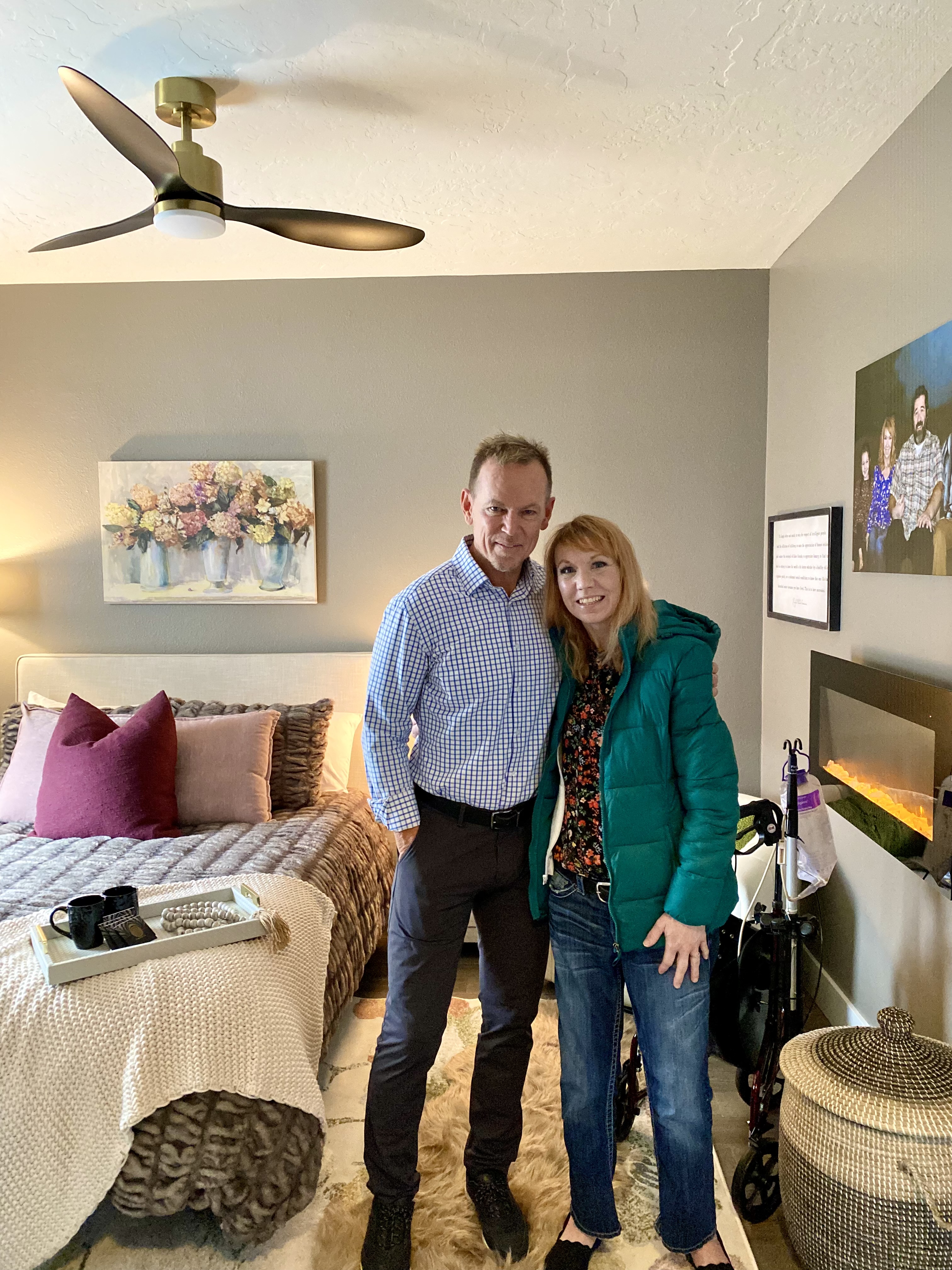 Bethany had moved to what was their office as she could no longer take the stairs due to her MS and was sleeping on a twin bed with office supplies. My Happy Place came in and gave the room a makeover from paint, flooring, all new furniture including a queen size bed, an electric fireplace, and new family photos they had taken.
