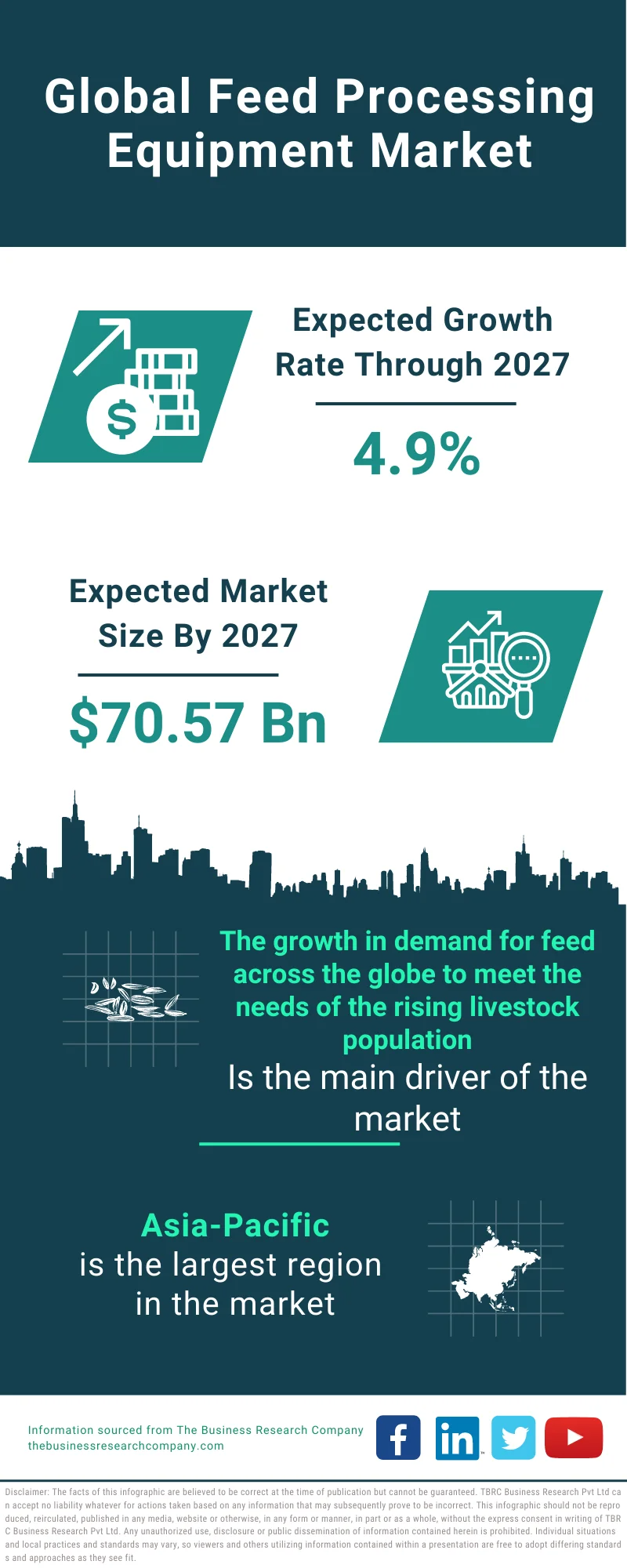 LONDON, GREATER LONDON, UK, December 26, 2023 /EINPresswire.com/ -- The Business Research Company’s “Feed Processing Equipment Global Market Report 2024 is a comprehensive source of information that covers every facet of the market. As per TBRC’s market forecast, the feed processing equipment market size is predicted to reach the feed processing equipment market size has grown strongly in recent years. It will grow from $52.79 billion in 2023 to $55.49 billion in 2024 at a compound annual growth rate (CAGR) of 5.1%. The growth in the historic period can be attributed to increasing demand for animal products, environmental regulations, globalization of the feed industry, emerging markets. the feed processing equipment market size is expected to see steady growth in the next few years. It will grow to $66.72 billion in 2028 at a compound annual growth rate (CAGR) of 4.7%.