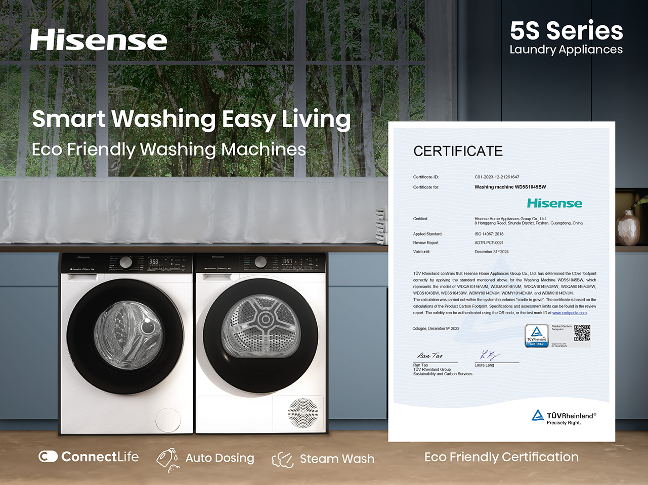 هايسنس تنال شهادة البصمة الكربونية للمنتج من مؤسسة تي يو في راينلاند عن الغسالة وآلة التجفيف من سلسلة هايسنس 5 إس